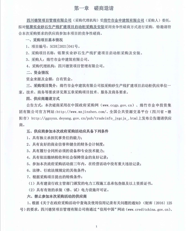 铭聚砂石生产线扩建项目启动柜采购及安装招标公告
