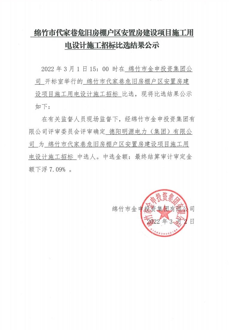 绵竹市代家巷建设项目施工用电设计施工招标比选结果公示