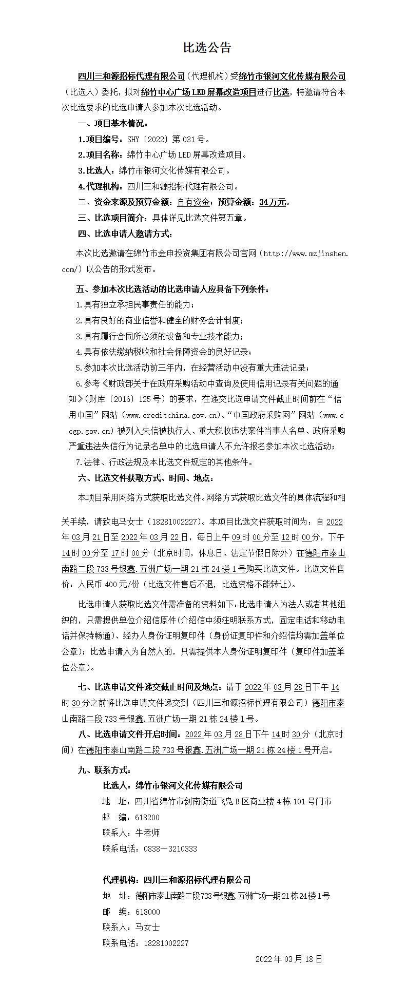 绵竹中心广场LED屏幕改造项目比选公告