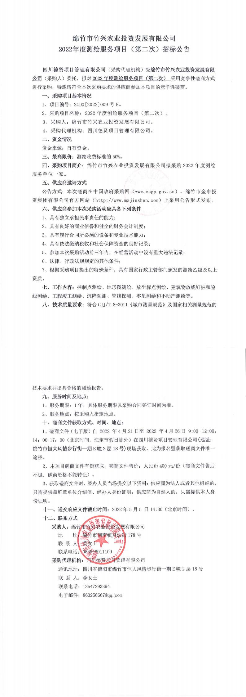 绵竹市竹兴农投公司2022年度测绘服务项目第二次招标公告
