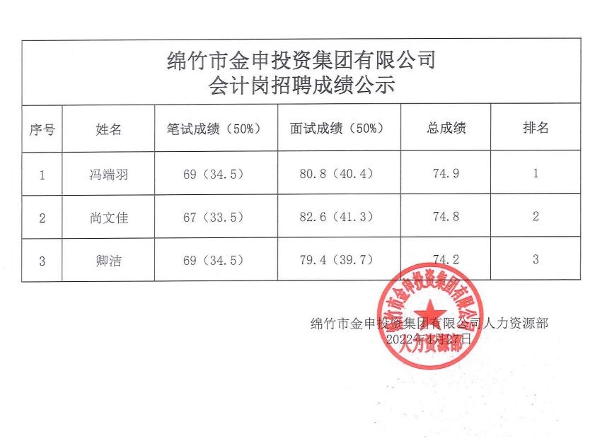 绵竹市金申投资集团有限公司会计岗招聘成绩公示