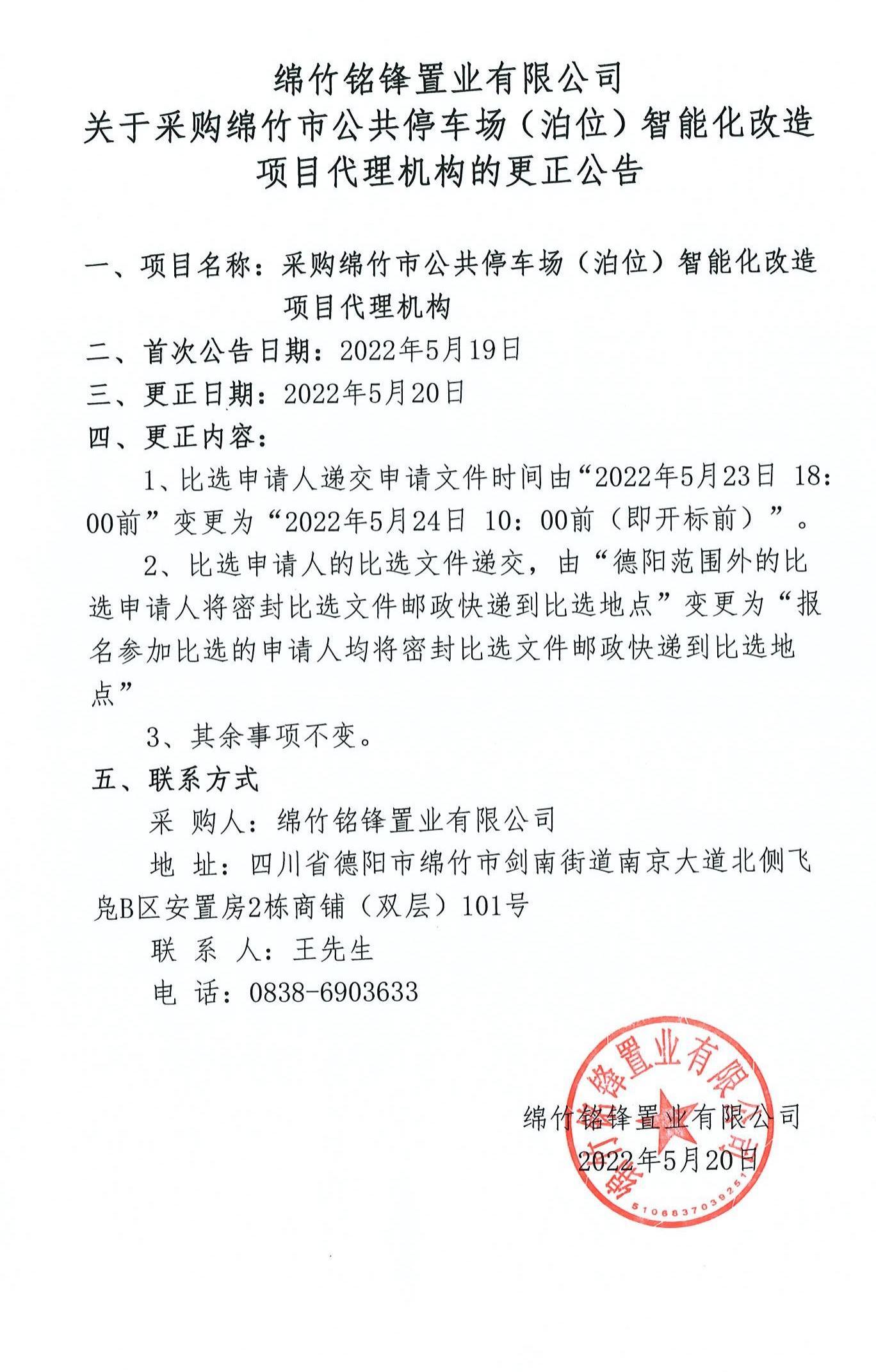 绵竹市公共停车场(泊位)智能改造代理机构比选更正公告