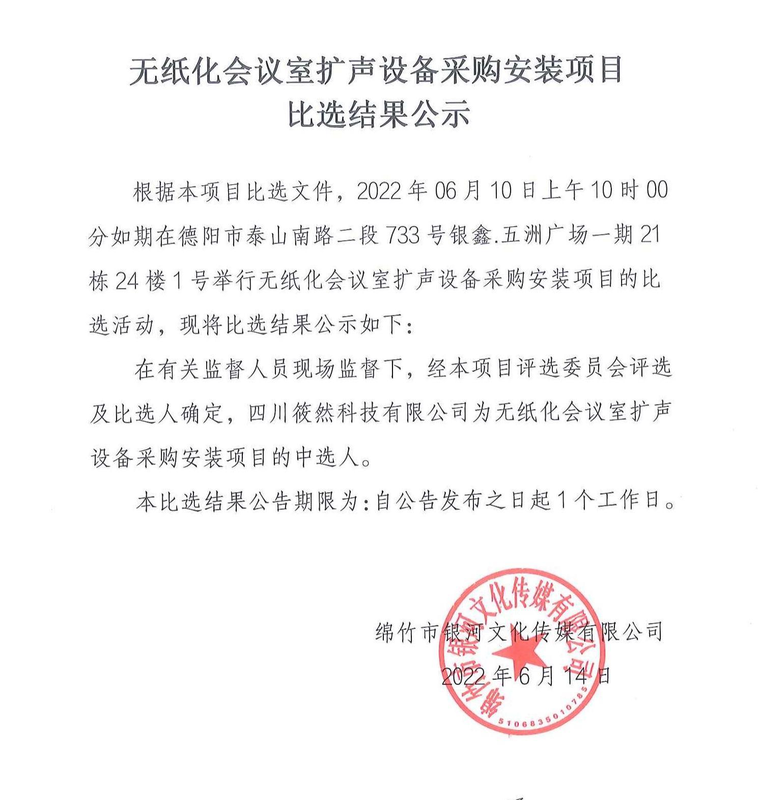 无纸化会议室扩声设备采购安装项目比选结果公示