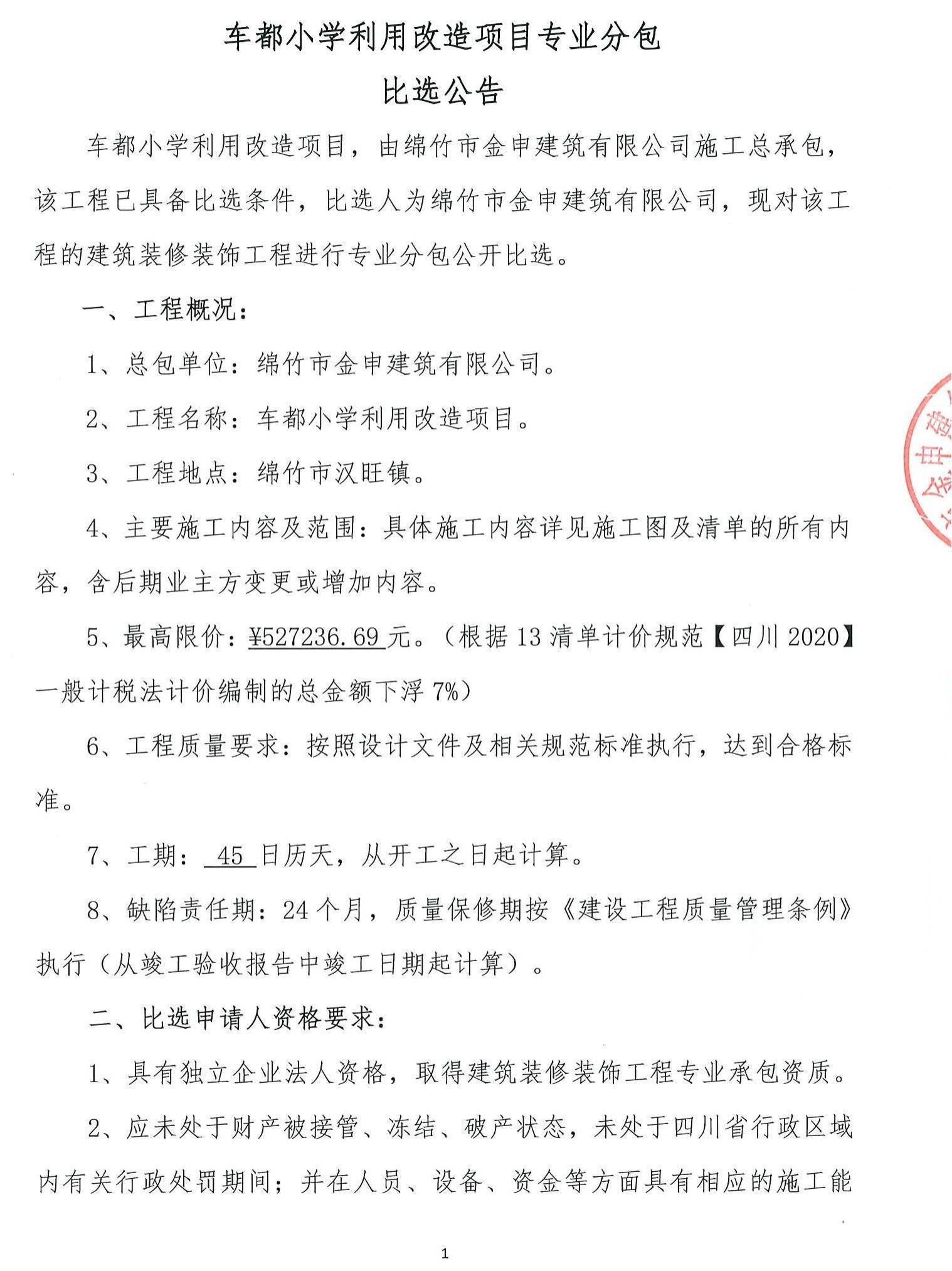 车都小学利用改造项目专业分包比选公告