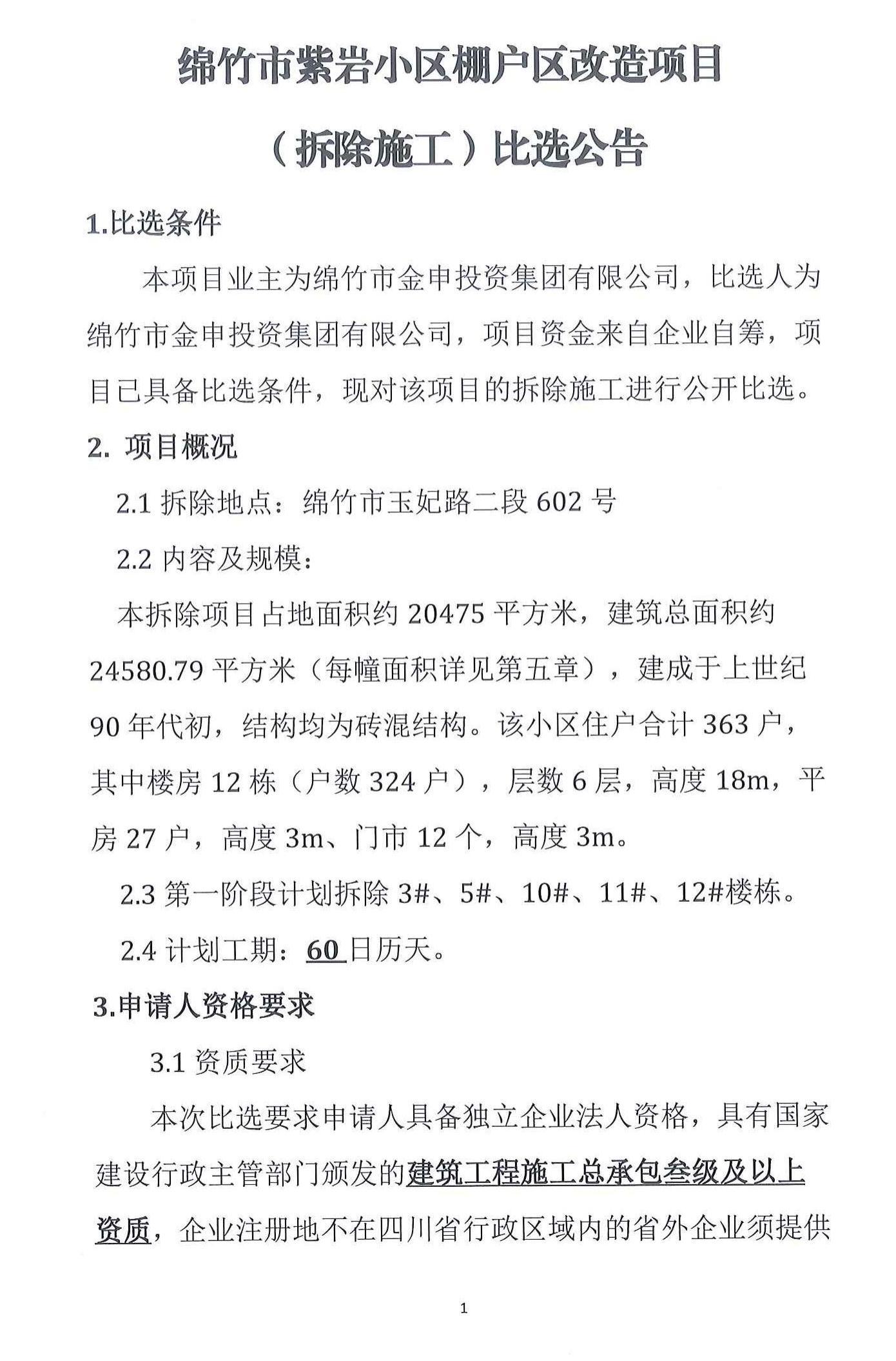 绵竹市紫岩小区棚户区改造项目(拆除施工)比选公告
