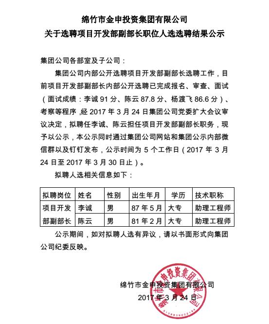 金申集团选聘项目开发部副部长结果公示