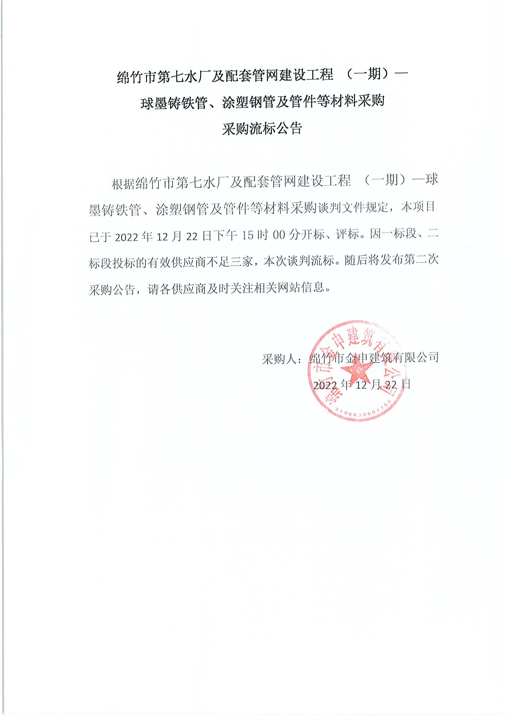 绵竹第七水厂配套管网建设工程(一、二)标段流标公告