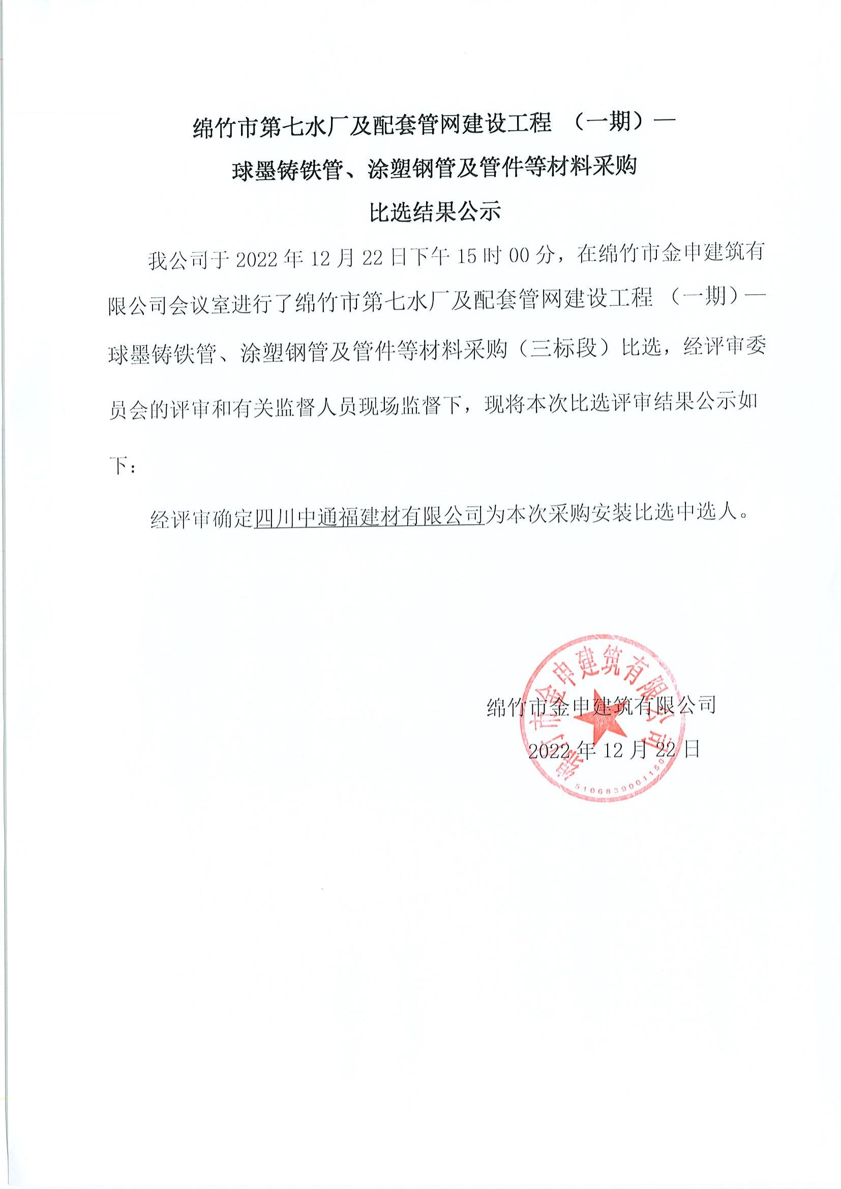 绵竹第七水厂配套管网建设工程(三标段)比选结果公示