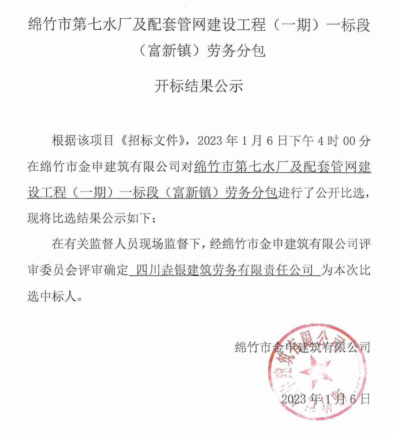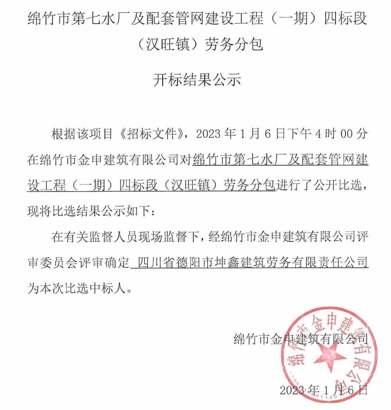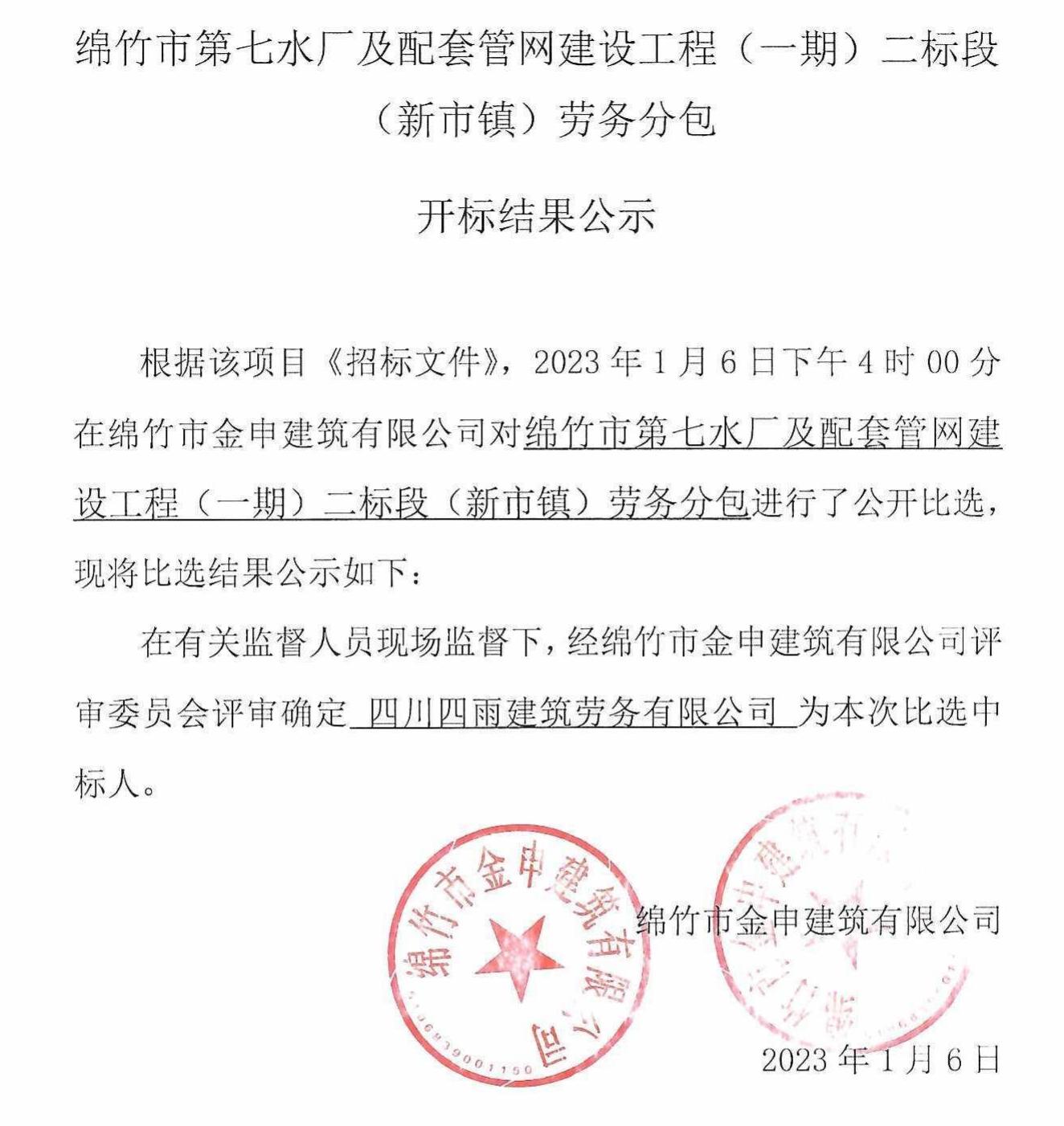 绵竹第七水厂配套管网建设(一期)劳务分包比选结果公示