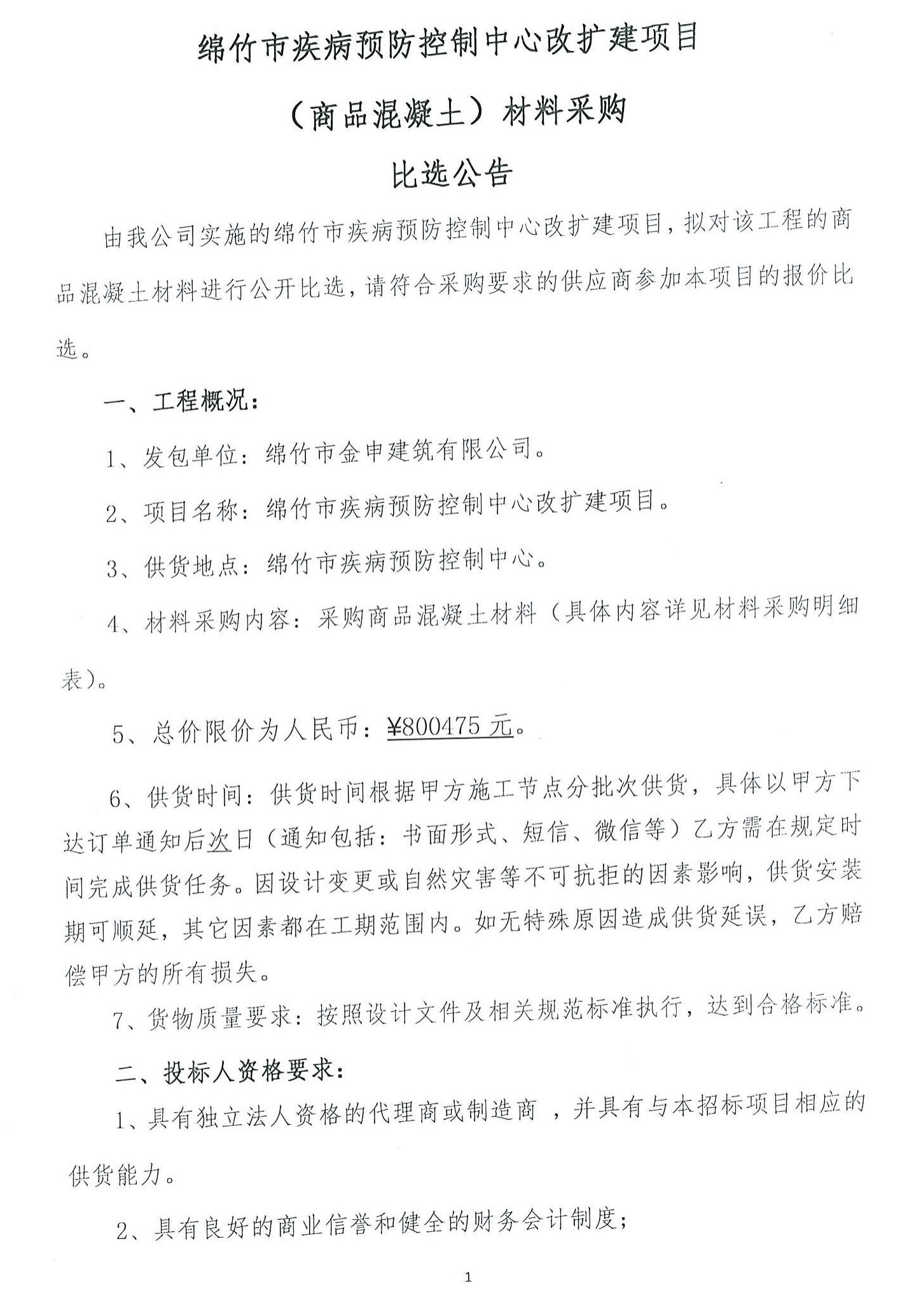 绵竹疾病预防中心改扩建项目(商品混凝土)材料采购比选公告