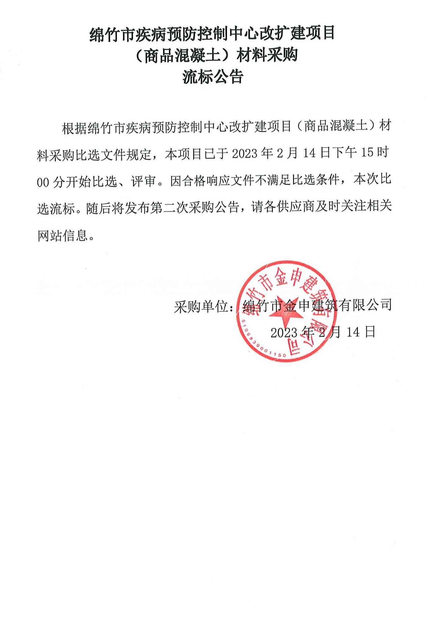 绵竹疾病预防中心改扩建项目(商品混凝土)材料采购流标公告