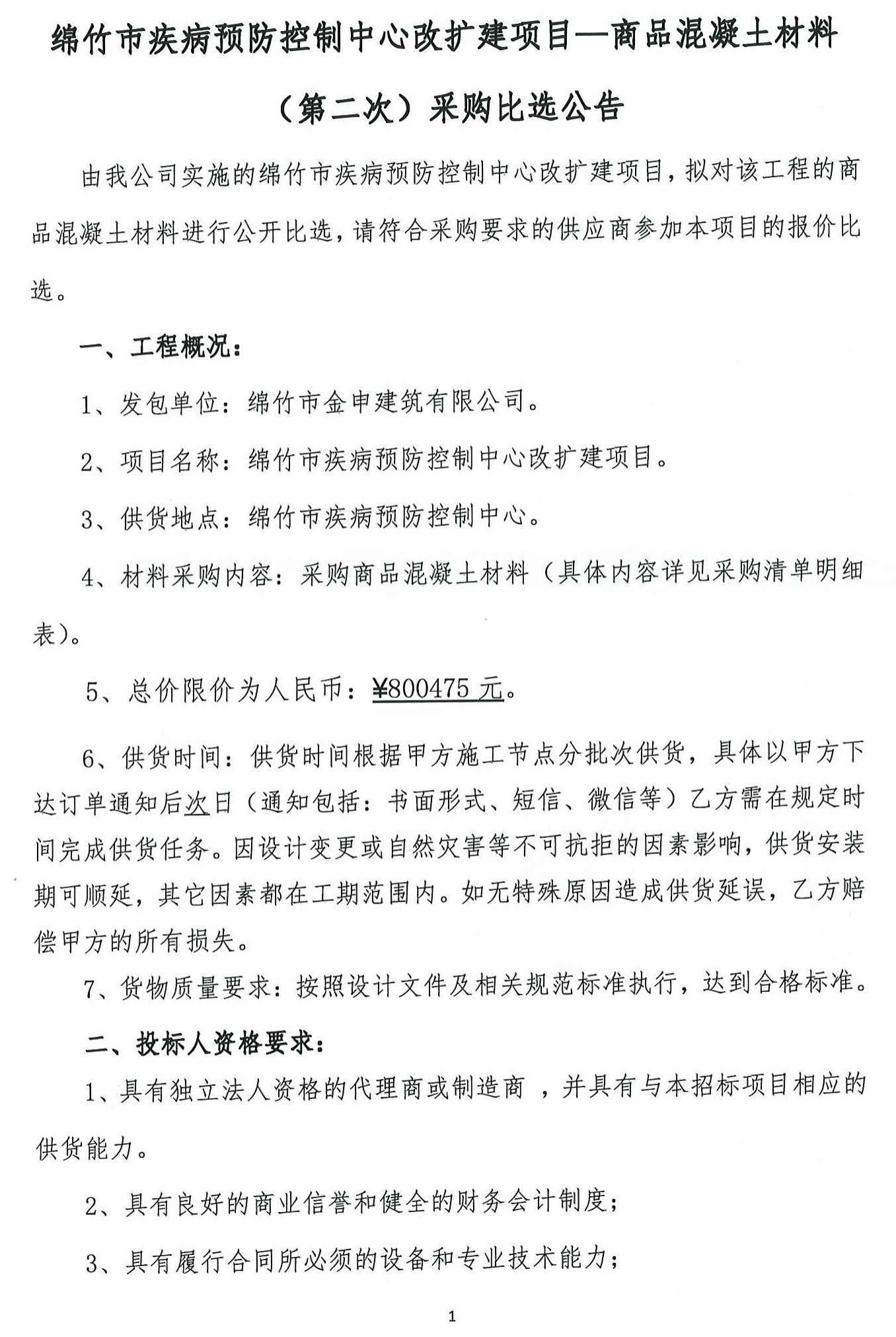 绵竹疾病预防中心改扩建项目(商品混凝土)第二次比选公告