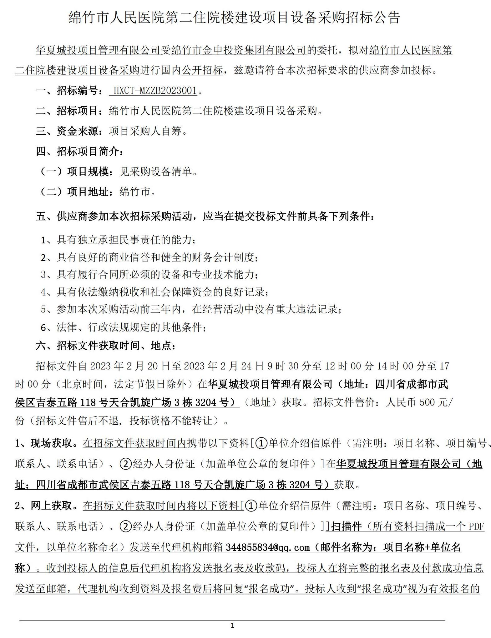 绵竹市人民医院第二住院楼建设项目设备采购招标公告