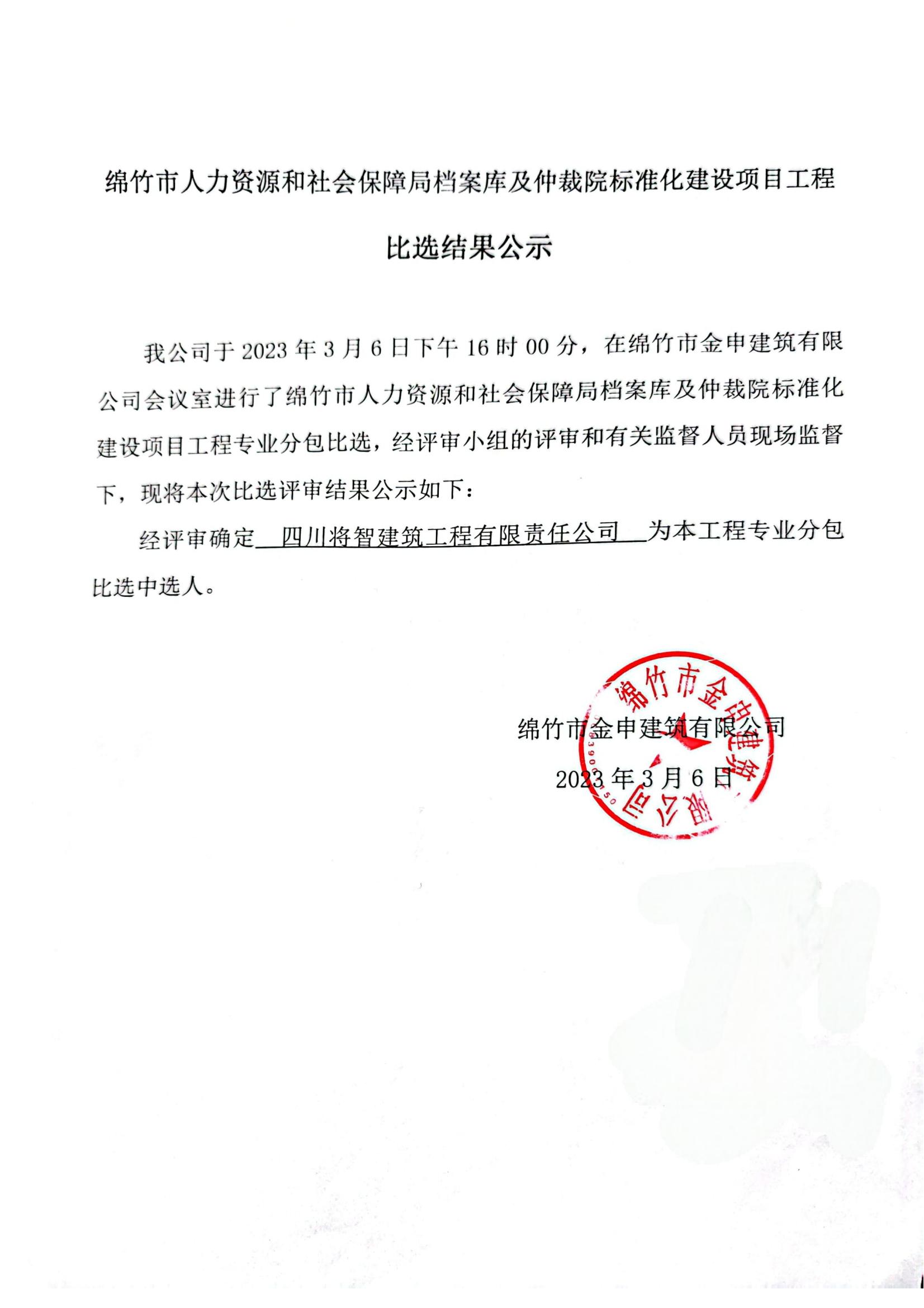 绵竹人社局档案库及仲裁院标准化建设项目比选结果公示