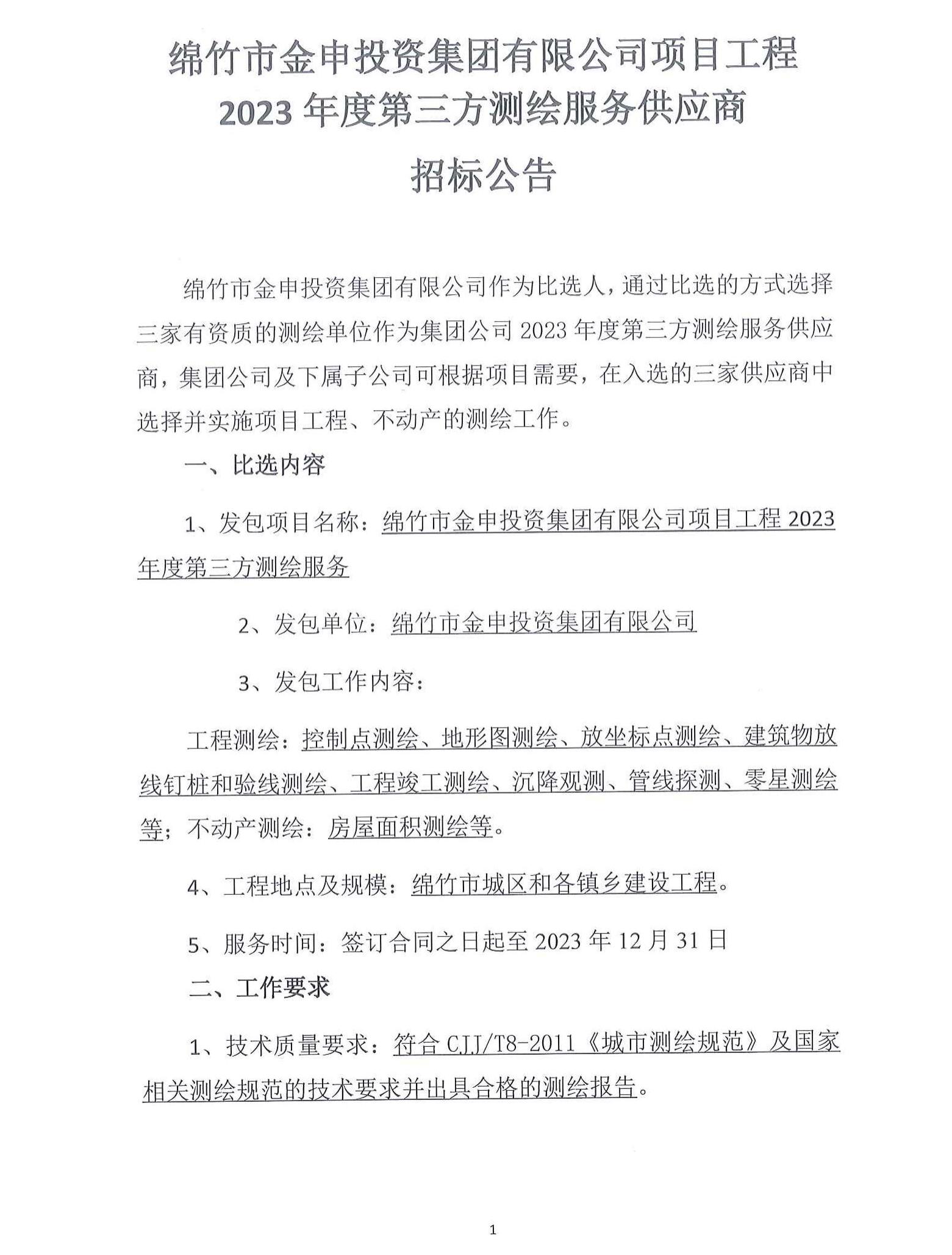 金申集团公司项目工程2023年第三方测绘服务供应商招标公告