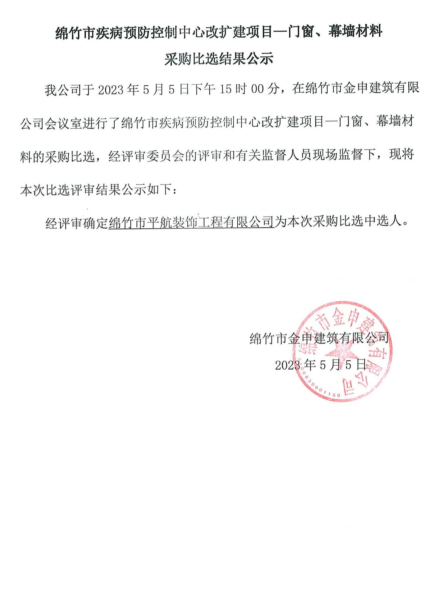 疾病预防控制中心改扩建项目门窗幕墙采购比选结果公示