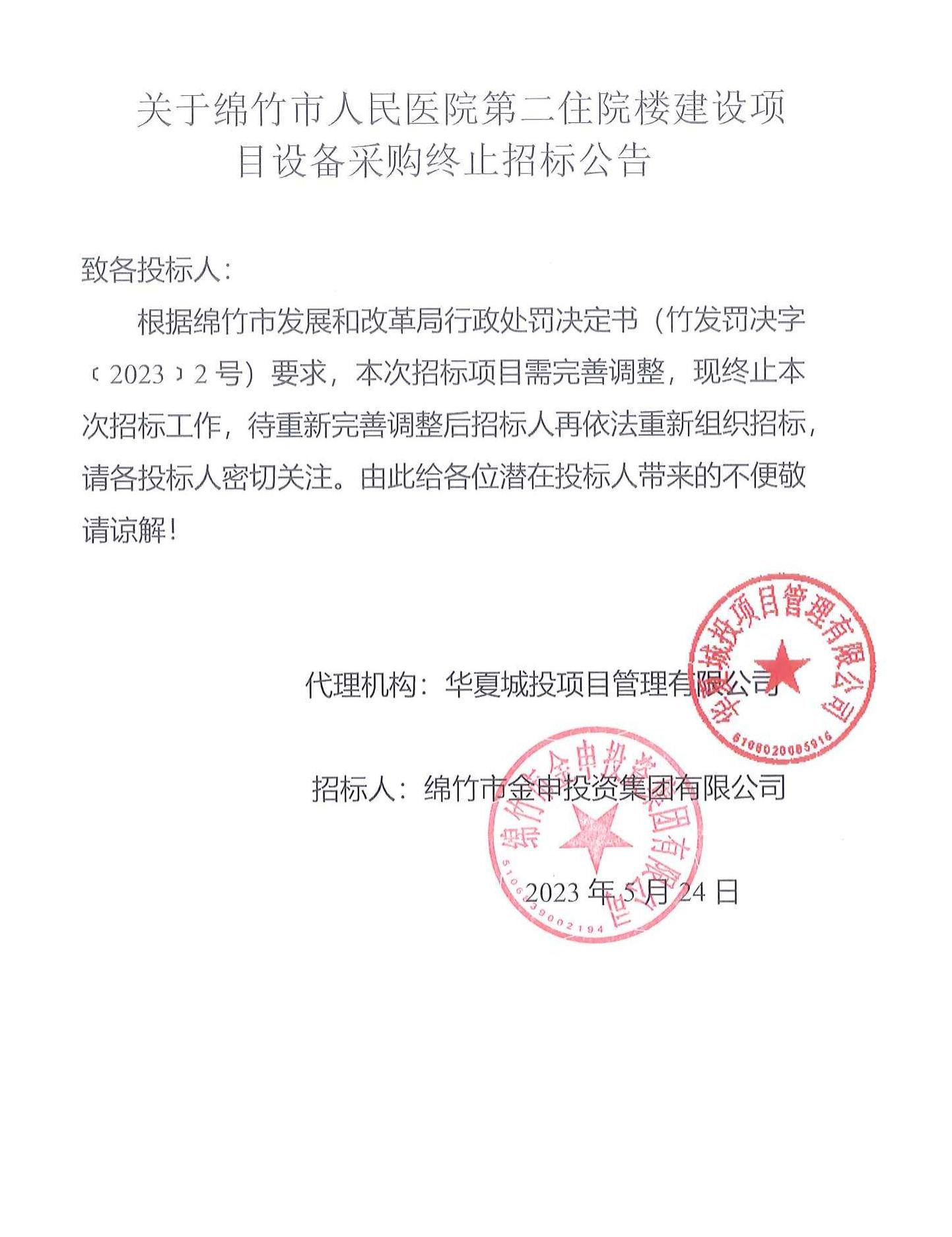 绵竹市人民医院第二住院楼建设项目设备采购终止招标公告