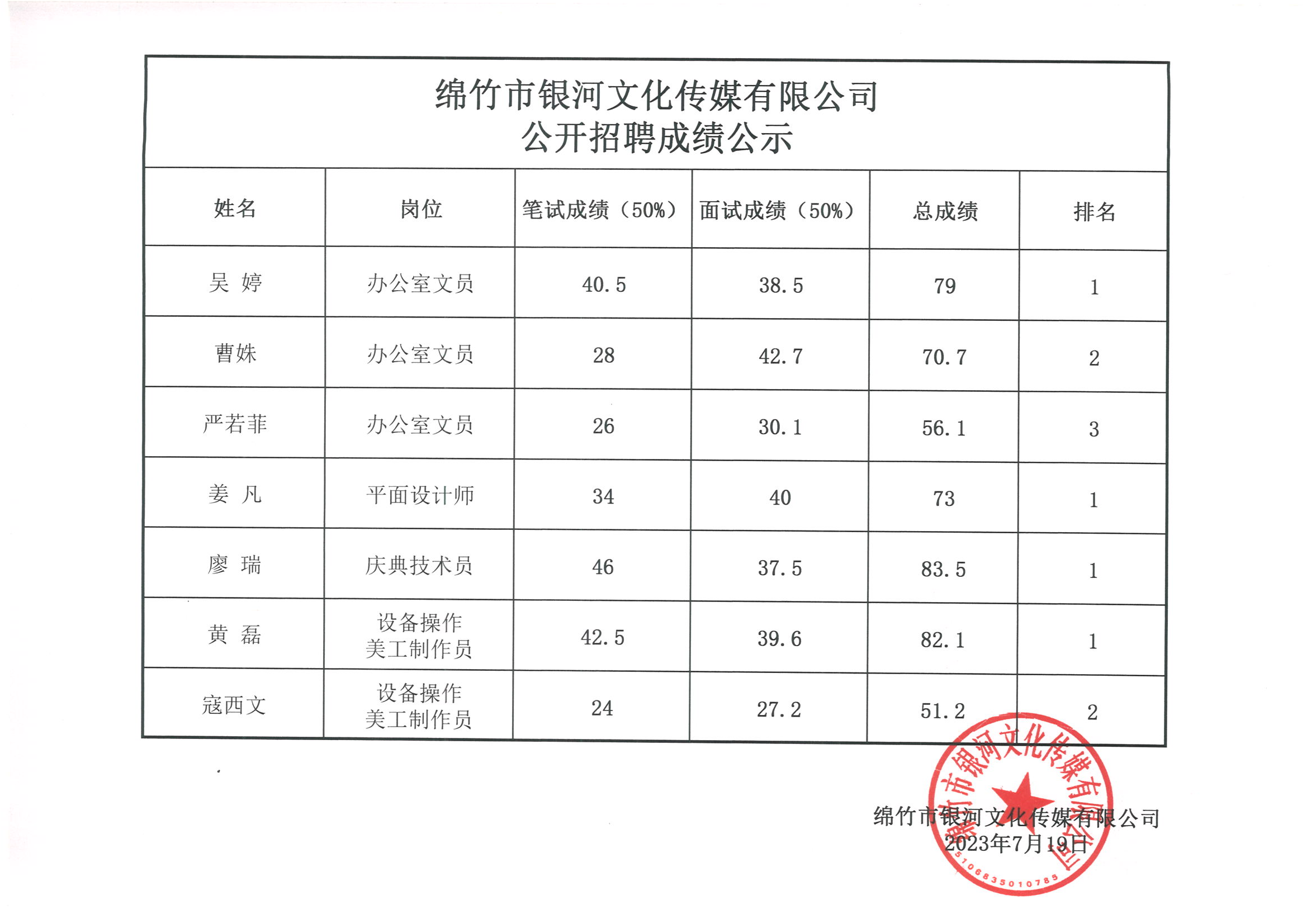绵竹市银河文化传媒有限公司公开招聘成绩公示