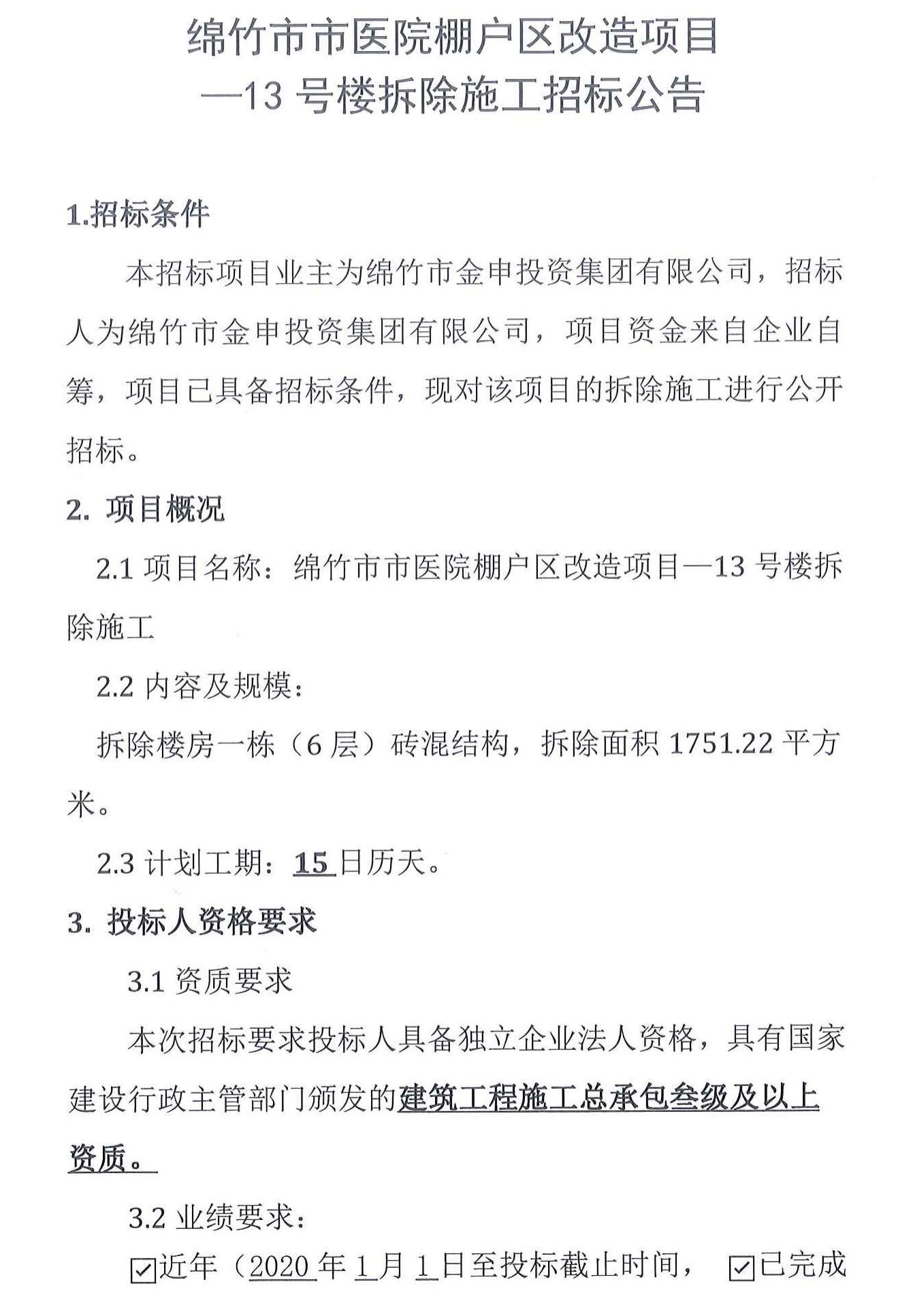绵竹市市医院棚户区改造项目-13号楼拆除施工招标公告