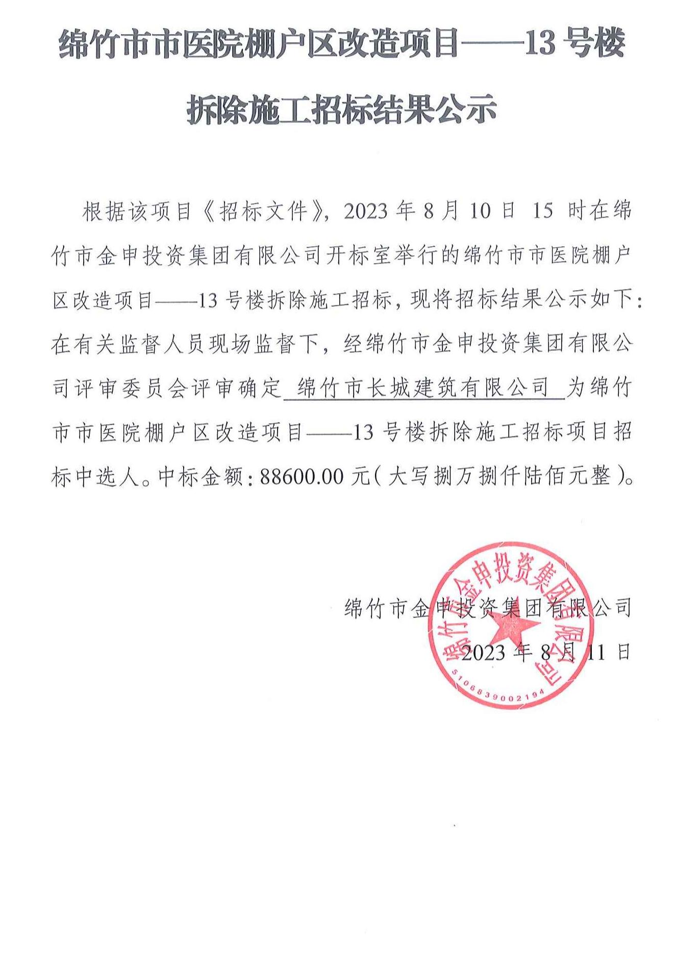 绵竹市市医院棚户区改造项目-13号楼拆除施工招标结果公示