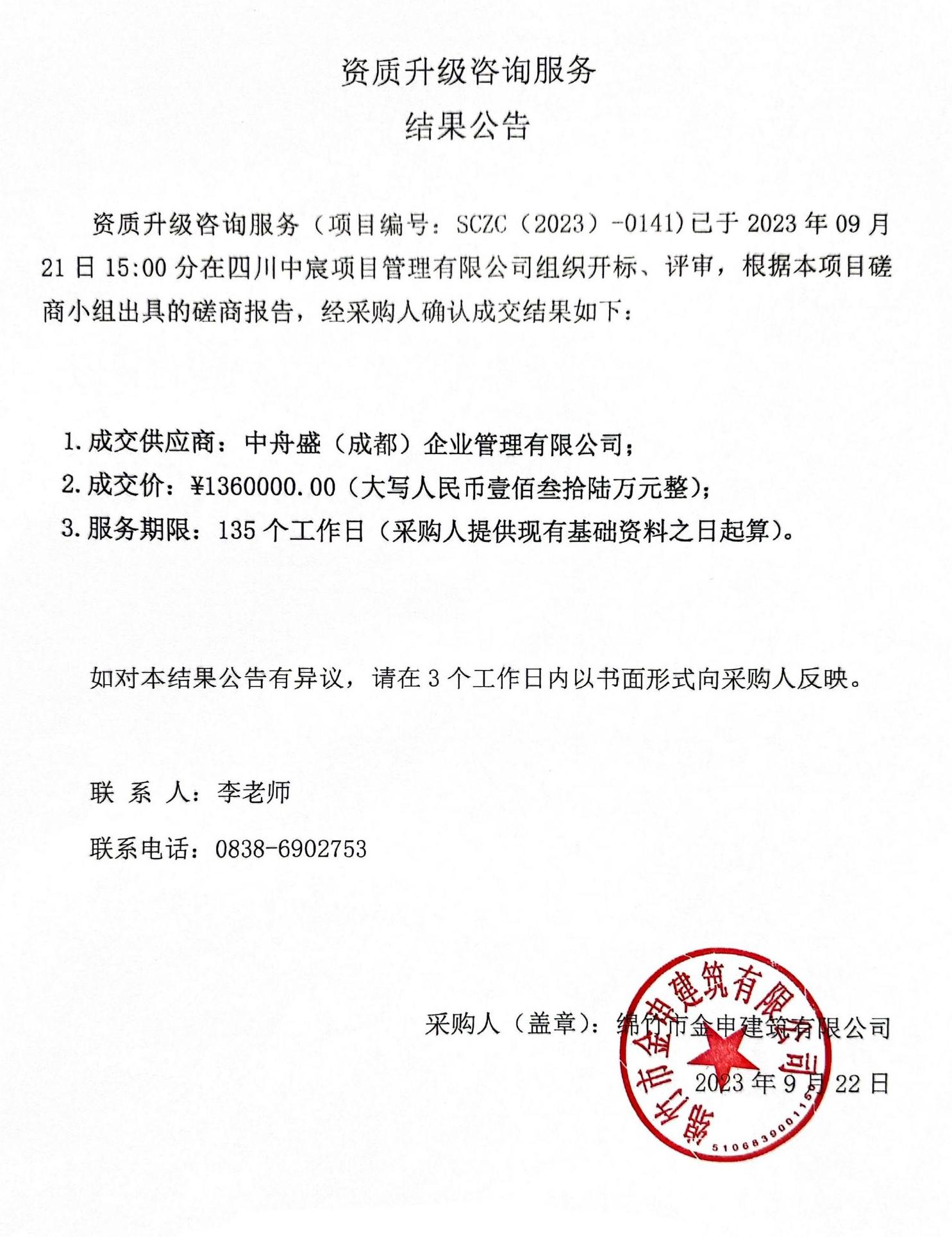金申建筑公司资质升级咨询服务竞争性磋商结果公示