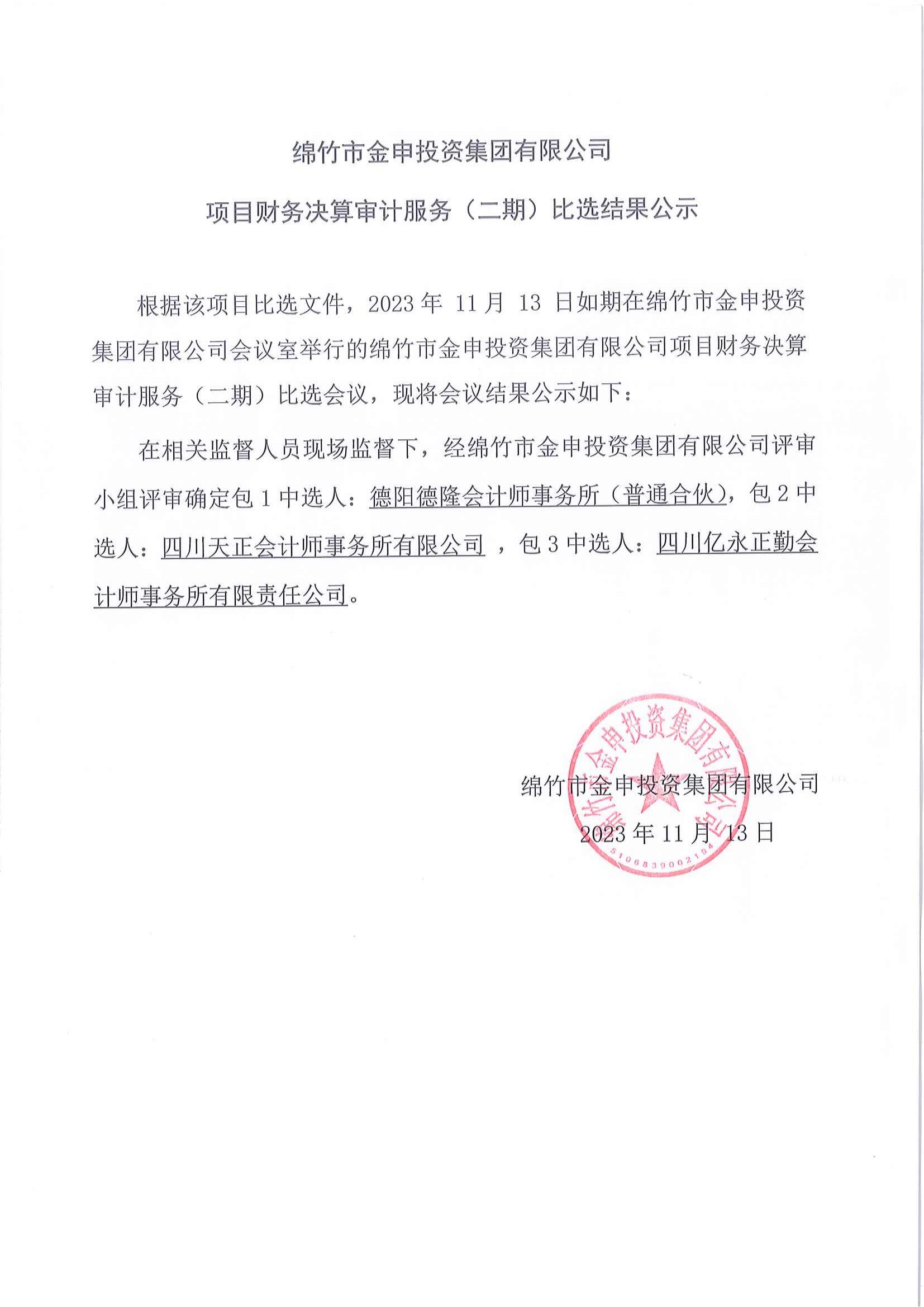 金申投资集团有限公司财务决算审计服务(二期)结果公示