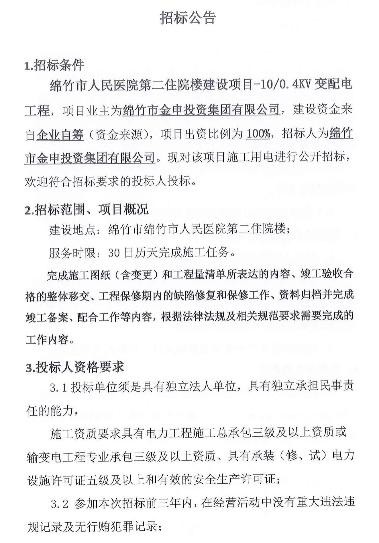 绵竹市人民医院第二住院楼建设项目变配电工程招标公告