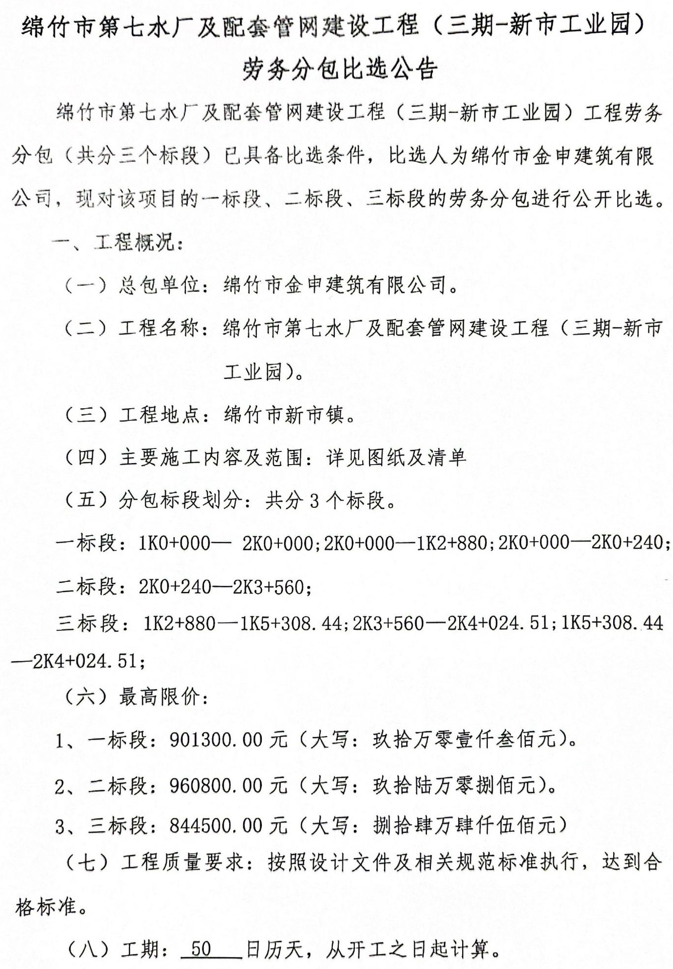 第七水厂及配套管网建设工程(三期)劳务分包比选公告