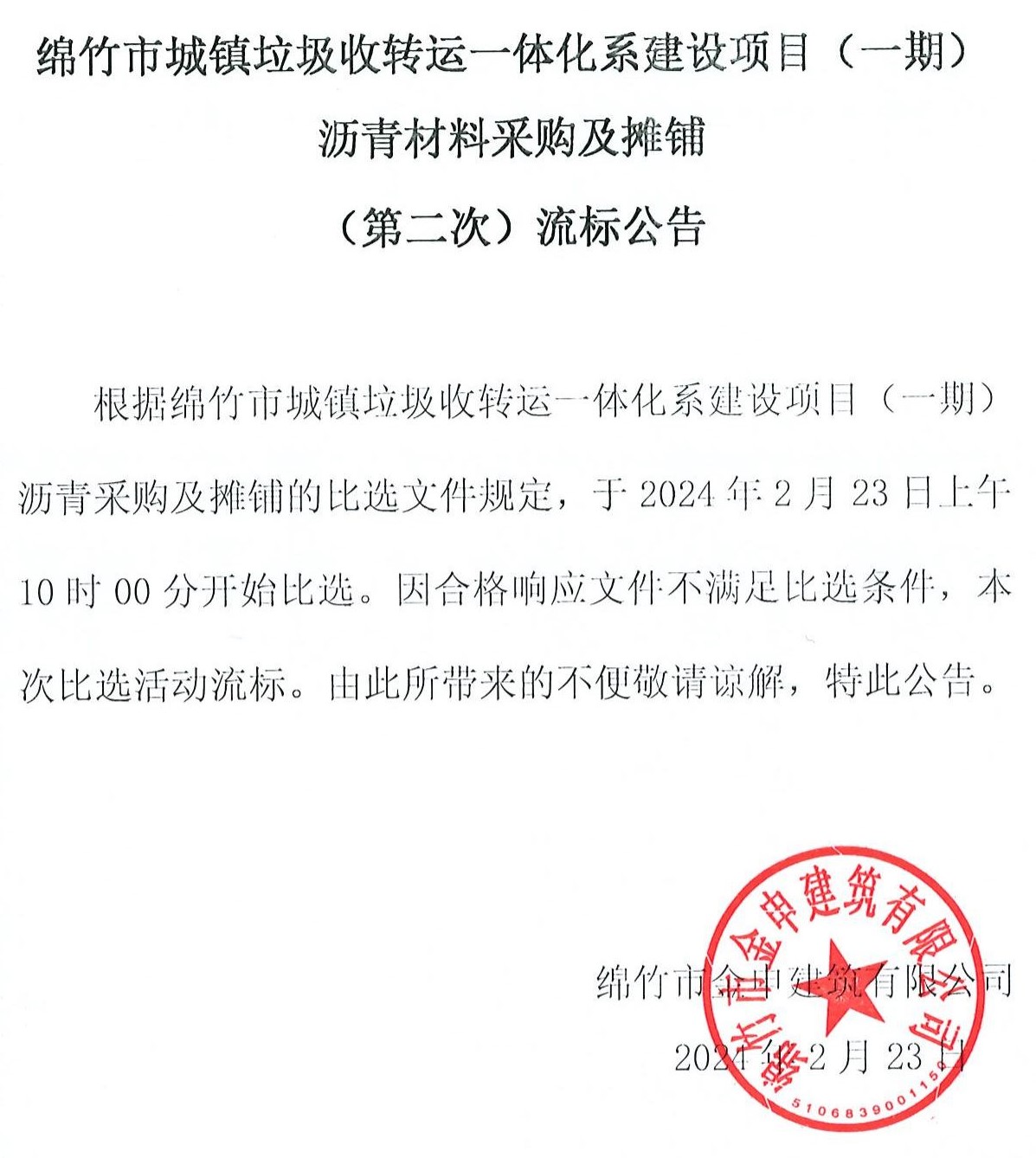 城镇垃圾收转运一体化(一期)沥青材料第二次流标公告
