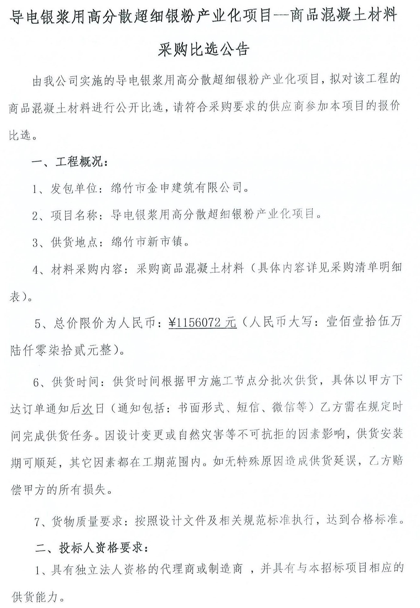导电银浆用高分散超细银粉项目商品混泥土采购比选公告