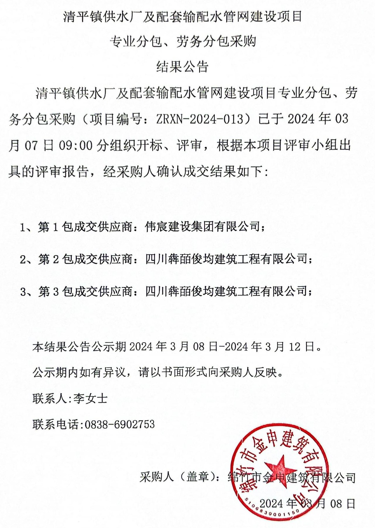 清平供水厂管网建设项目专业分包、劳务分包采购结果公示