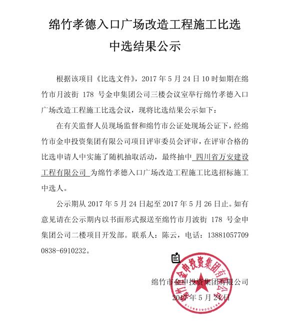 绵竹孝德入口广场改造工程施工比选中选结果公示