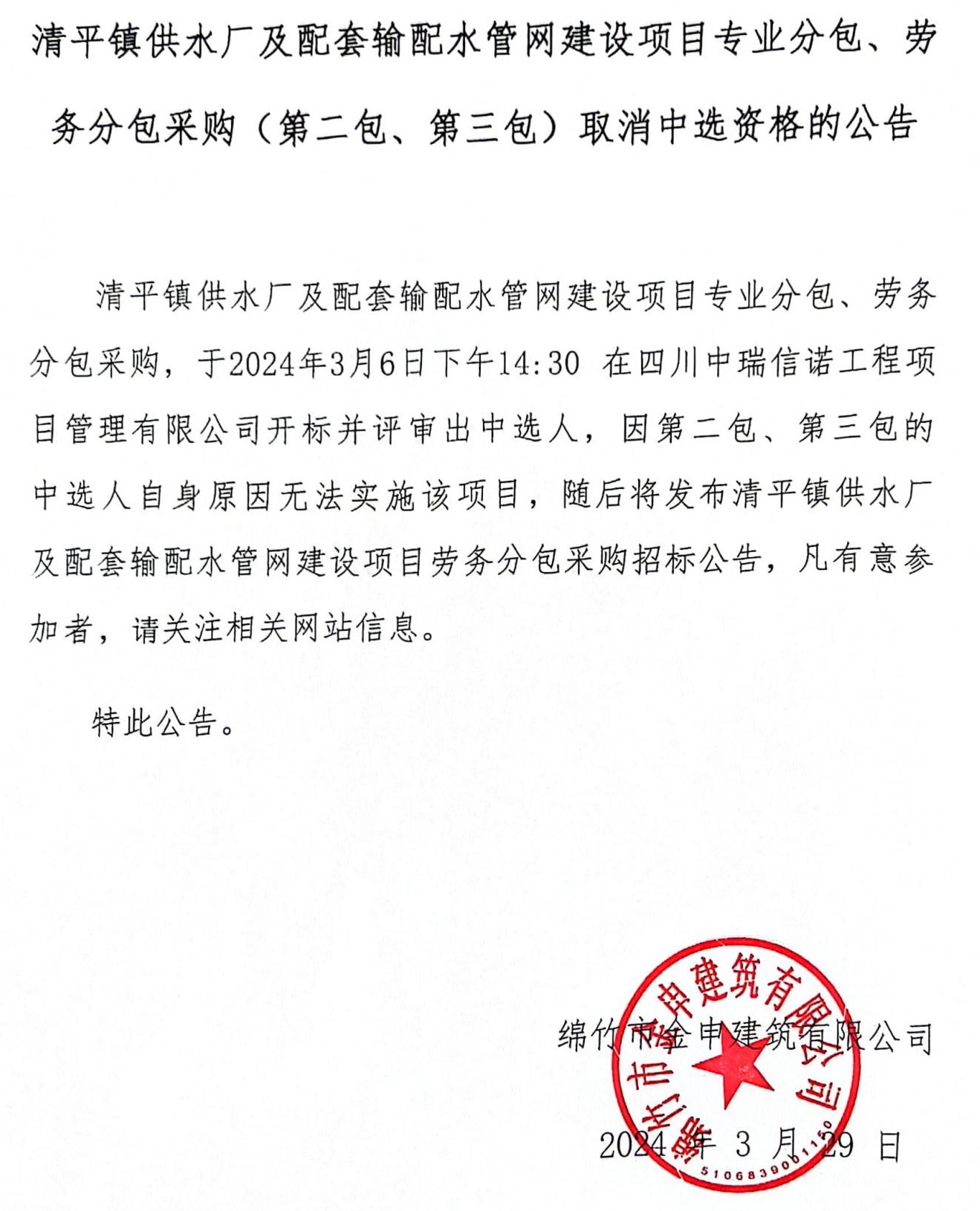 清平供水厂管网建设项目劳务分包取消中选资格公示