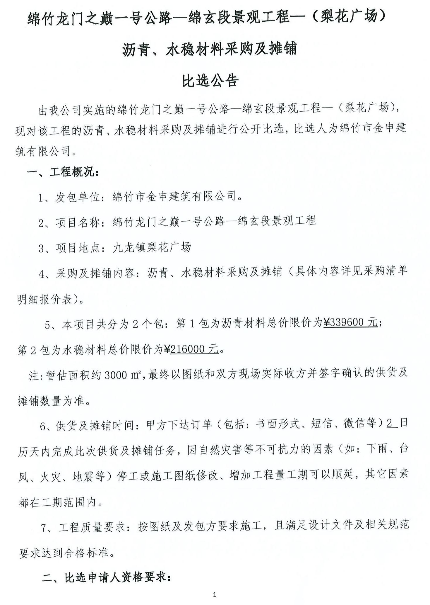 龙门之巅一号公路绵玄段(梨花广场)沥青、水稳比选公告