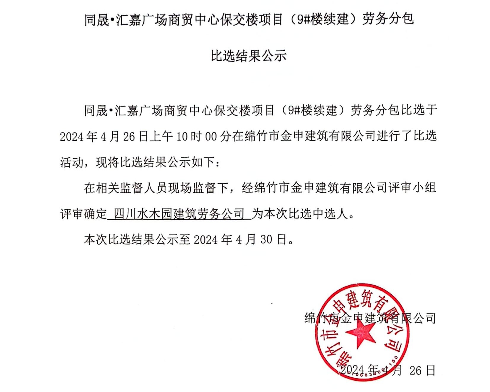 同晟·汇嘉广场商贸中心保交楼(9#楼续建)比选结果公示