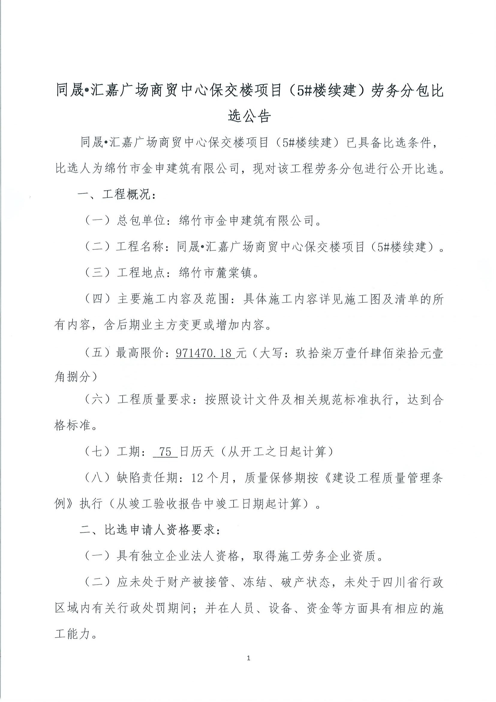 同晟·汇嘉广场商贸中心保交楼(5#楼续建)劳务分包比选公告