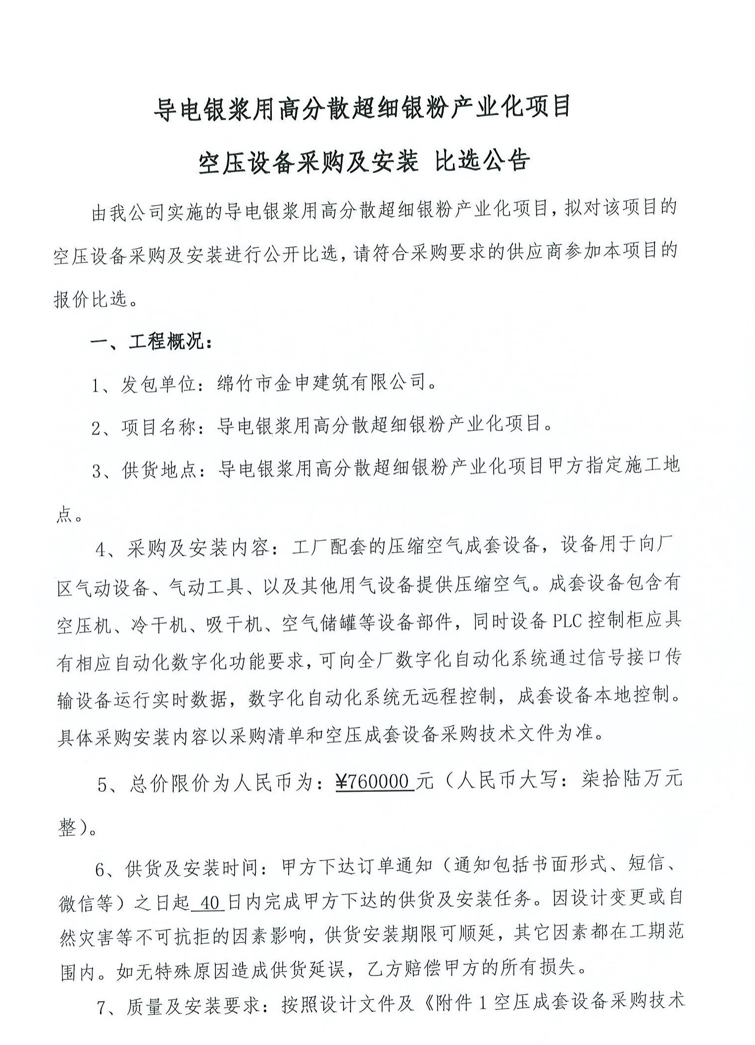 导电银浆用高分散超细银粉产业化项目 空压设备 比选公告