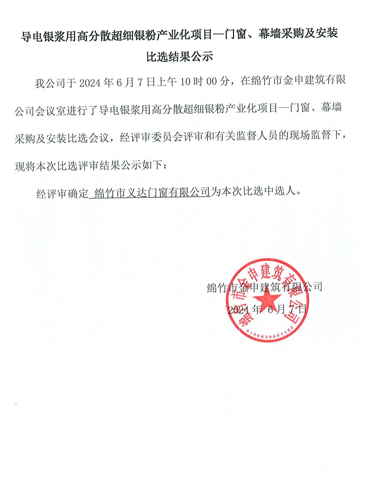 导电银浆用高分散超细银粉产业化项目门窗招标结果公示
