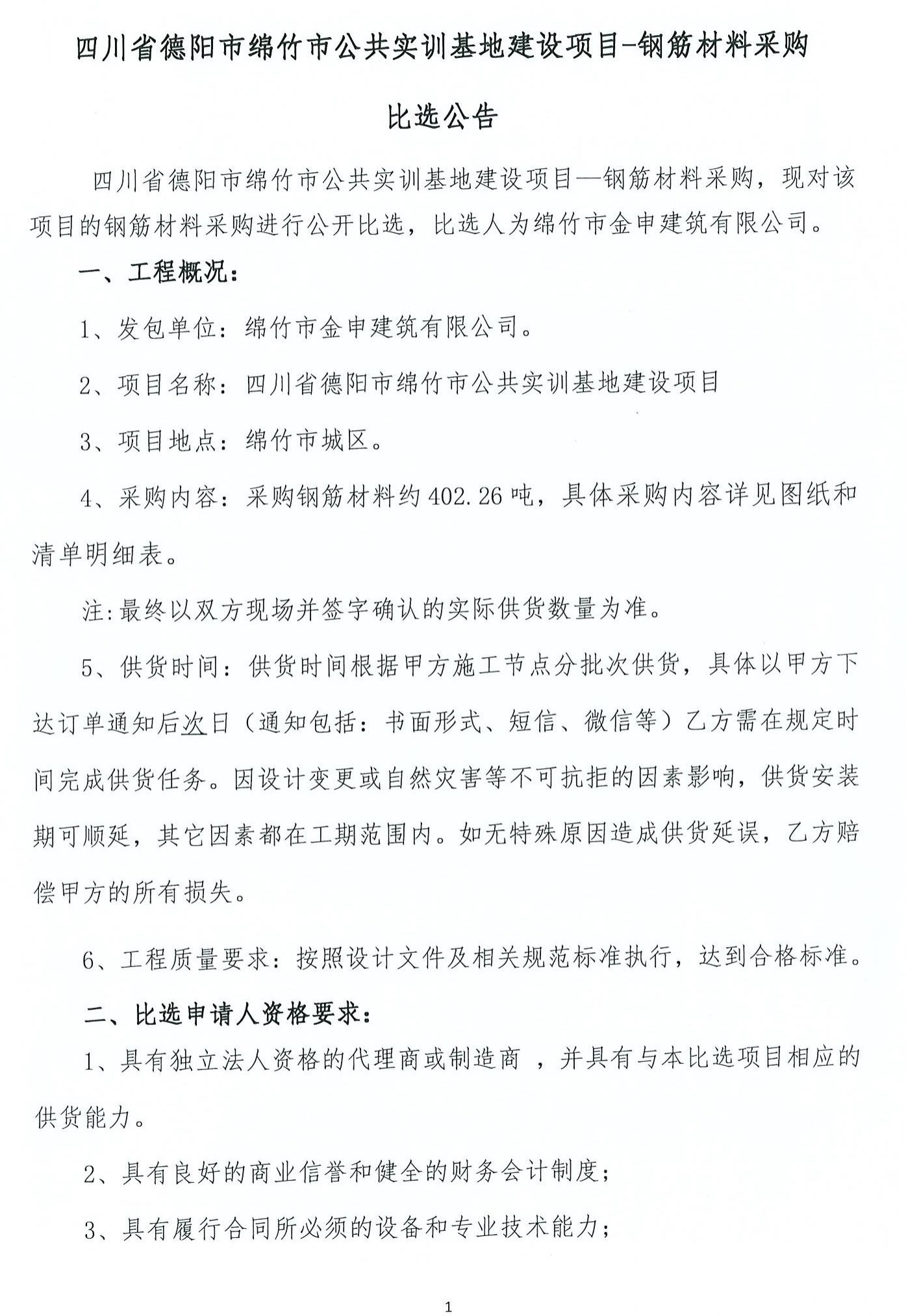 公共实训基地建设项目-钢筋材料采购比选公告