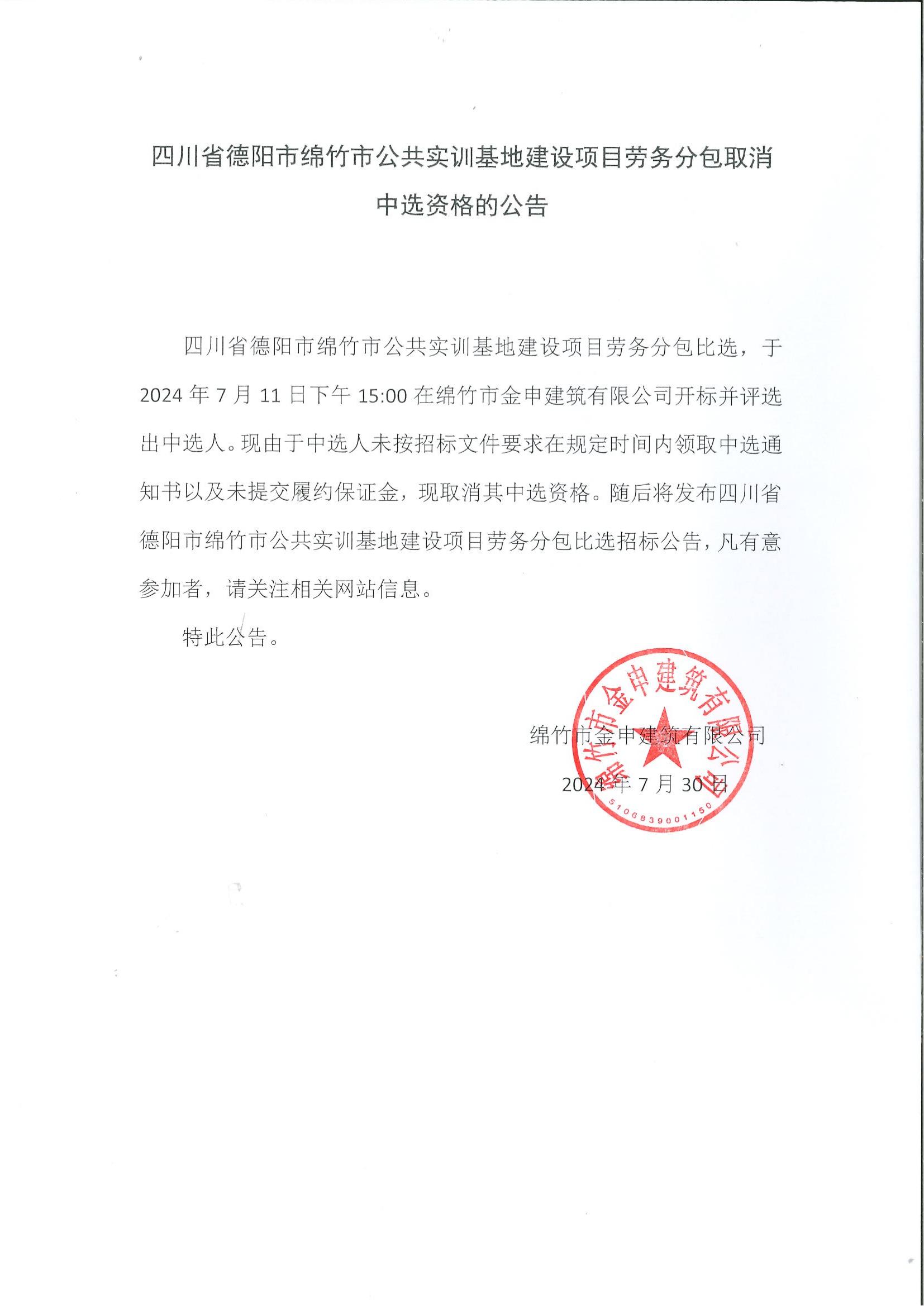 绵竹市公共实训基地建设项目劳务分包取消中选资格的公告