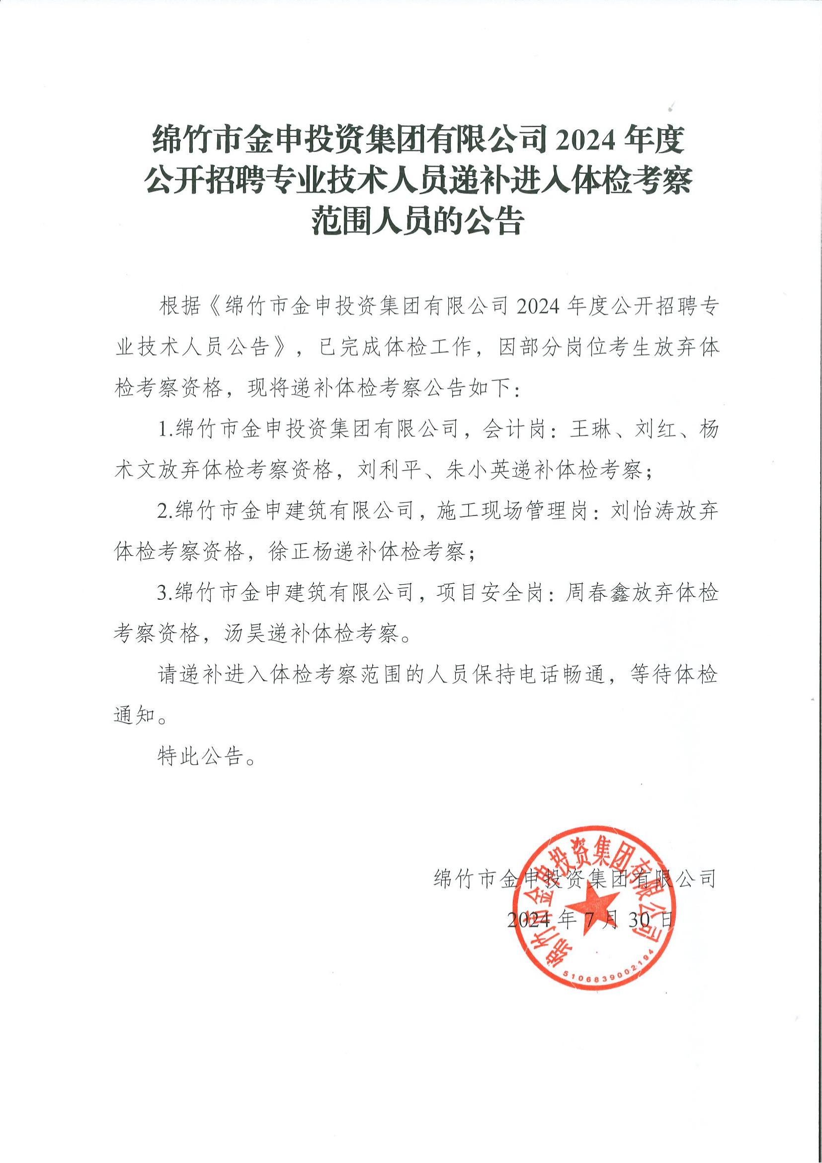 公开招聘专业技术人员递补进入体检考察范围人员的公告