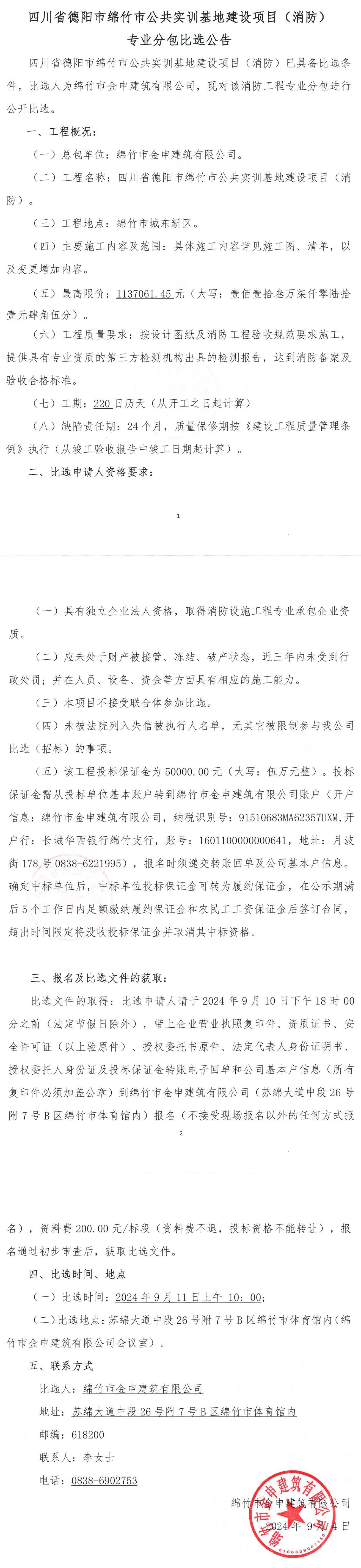 绵竹市公共实训基地建设项目(消防)专业分包比选公告