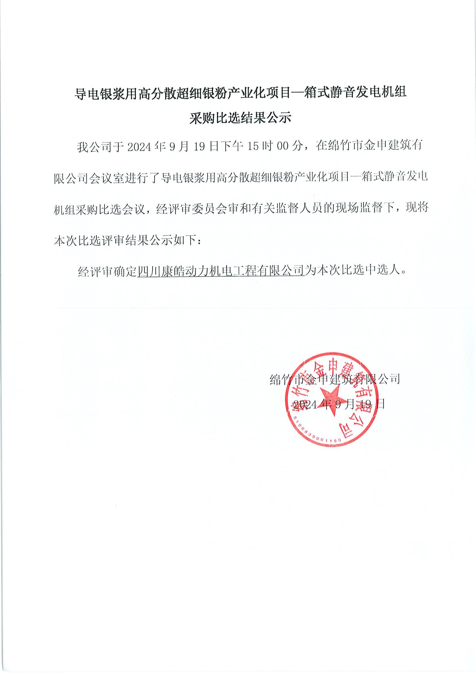 导电银浆项目(箱式静音发电机组)采购比选结果公示