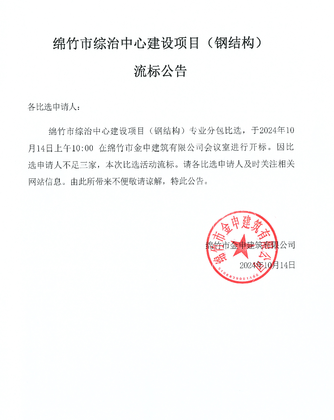 绵竹市综治中心建设项目(钢结构) 流标公告