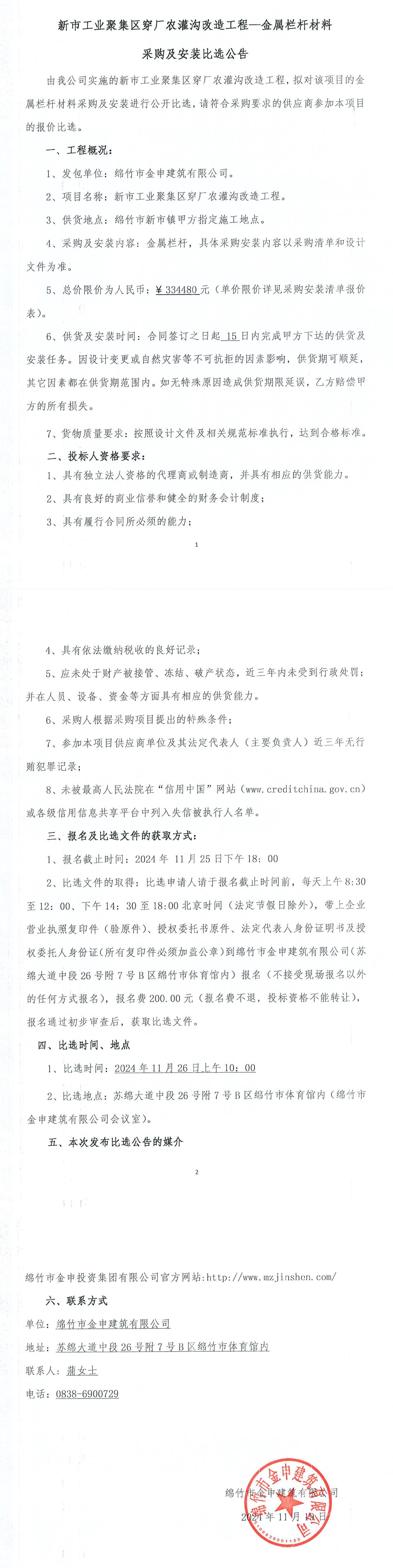 新市工业园农灌沟改造—金属栏杆采购及安装比选公告
