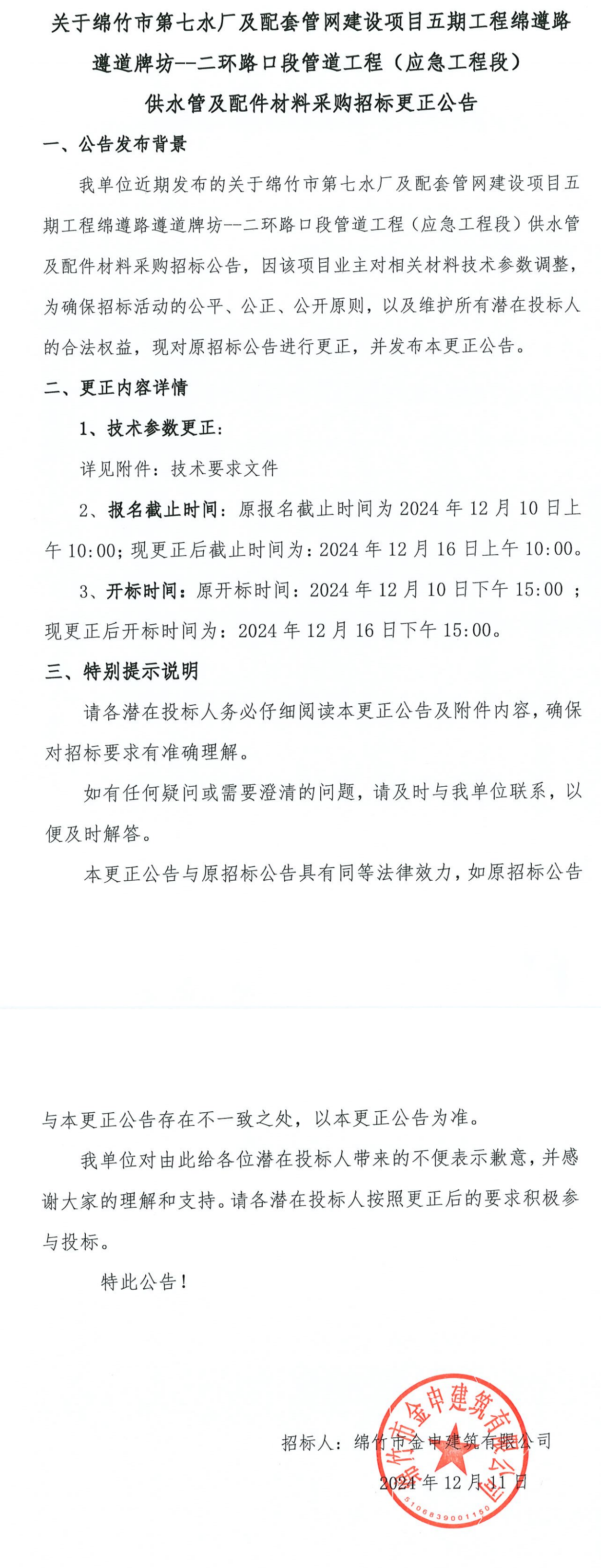 第七水厂及配套管网建设五期-供水管及配件招标更正公告