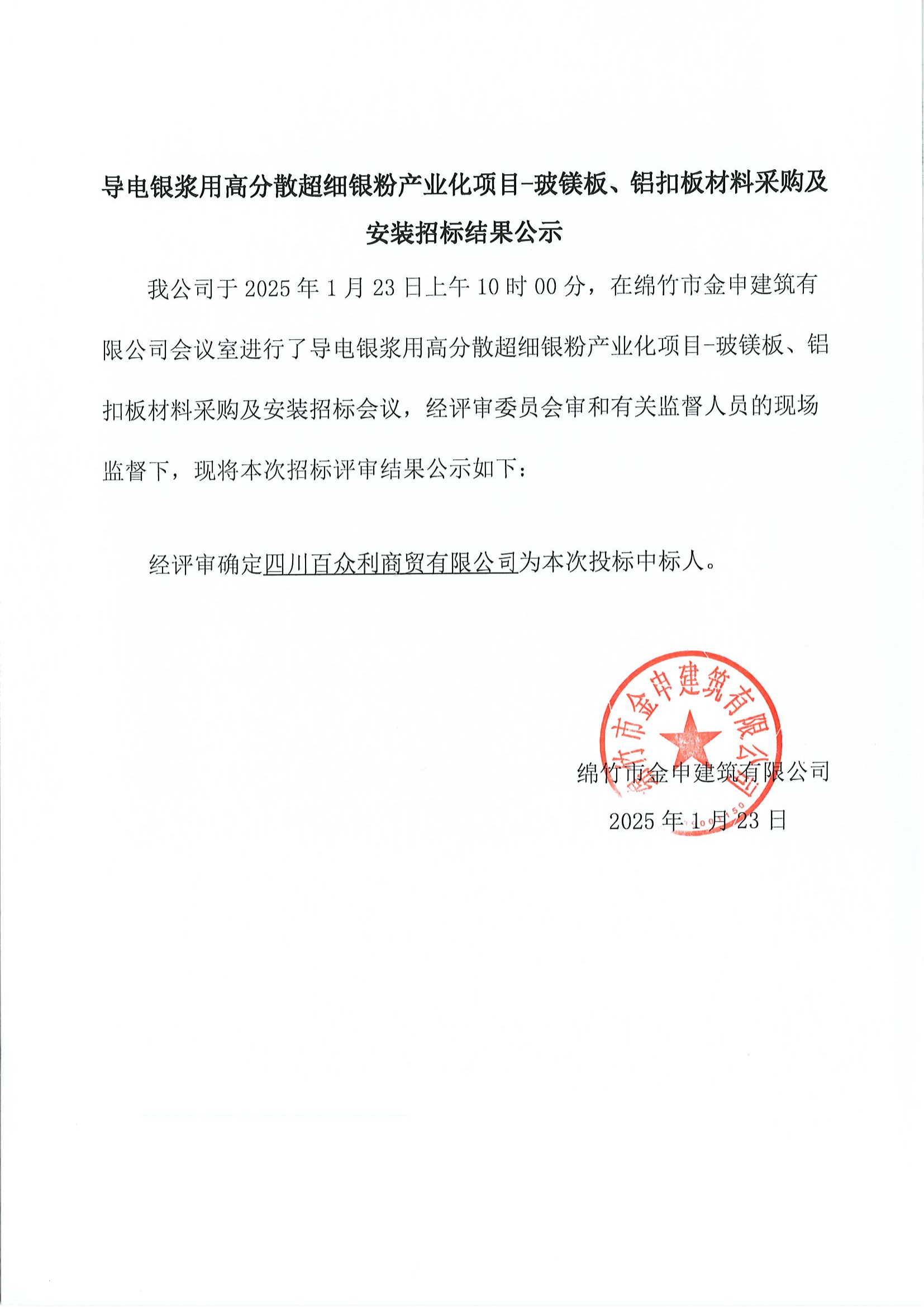 导电银浆用高分散超细银粉玻镁板、铝扣板招标结果公示