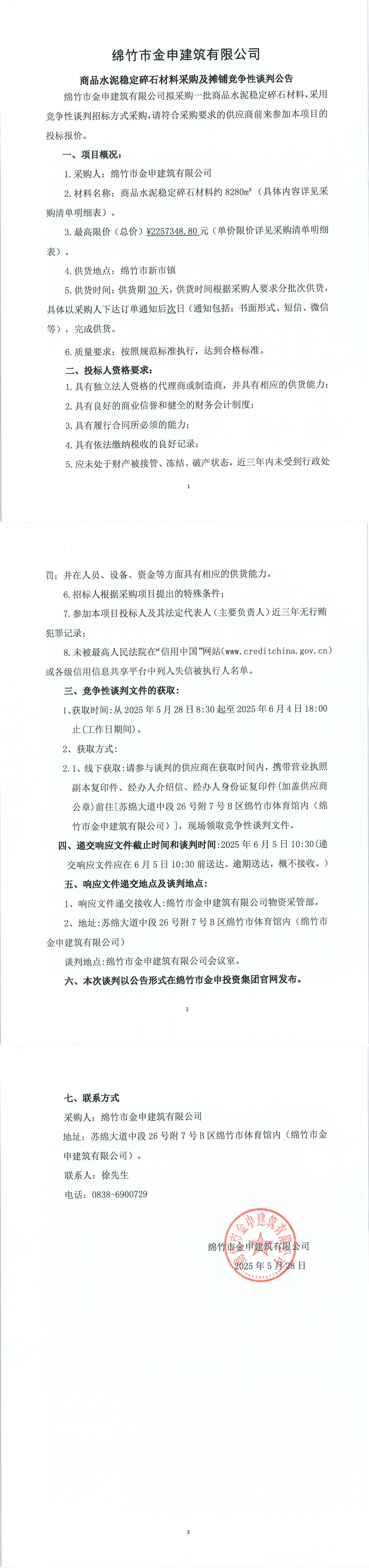 金申建筑商品水泥稳定碎石材料采购及摊铺竞争性谈判公告