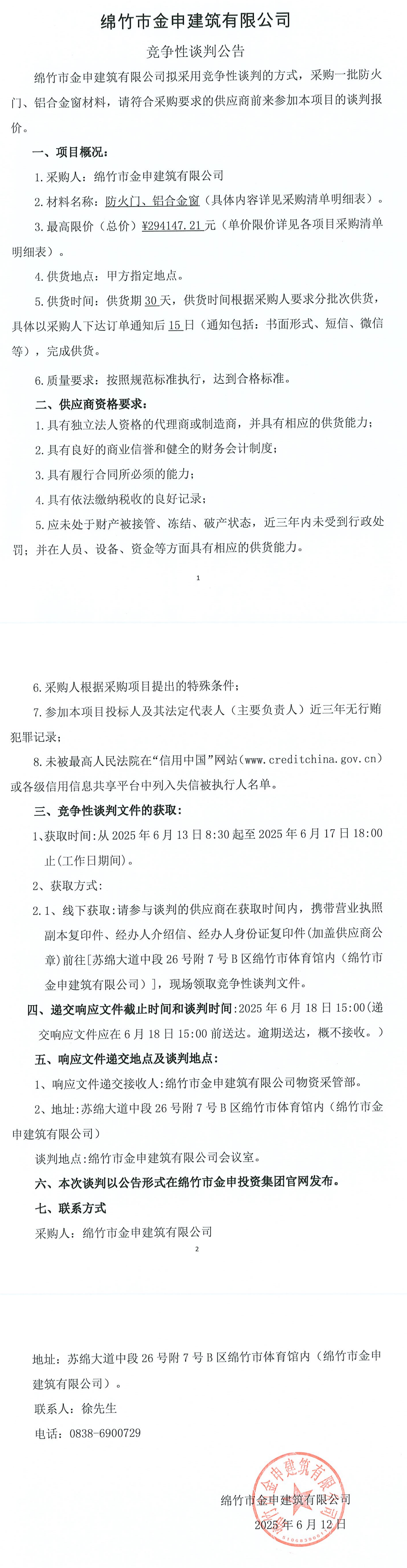 采购一批防火门、铝合金窗材料的竞争性谈判公告