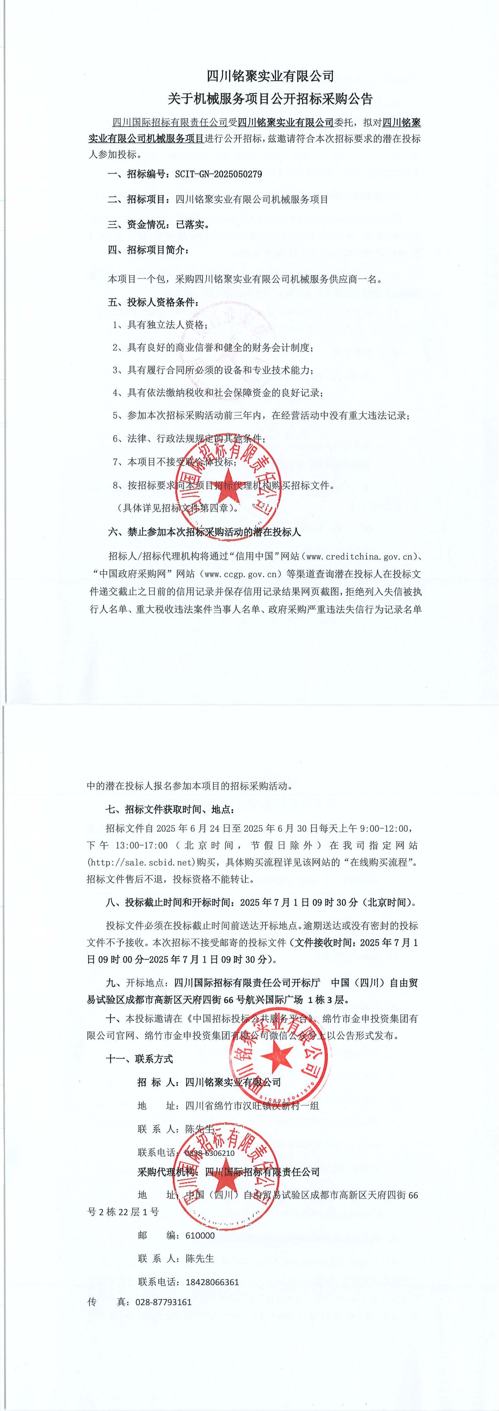四川铭聚实业有限公司关于机械服务项目公开招标采购公告